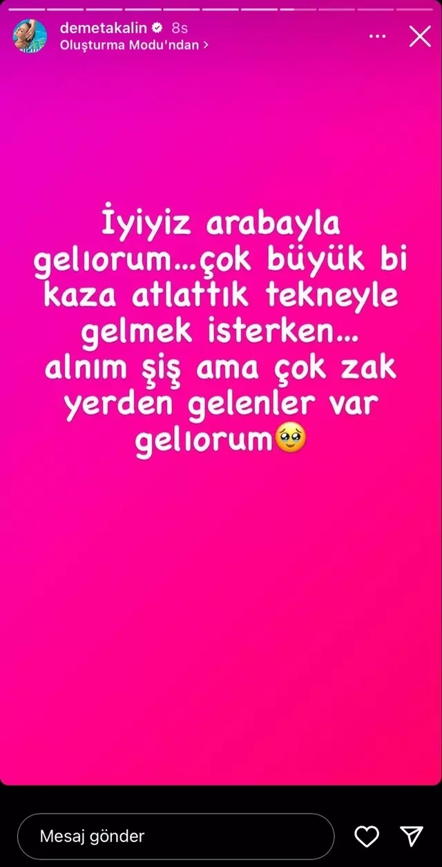 Çok büyük bir tekne kazası geçirdiklerini dile getiren Demet Akalın, "İyiyiz. Arabayla geliyorum. Tekneyle gelmek isterken çok büyük bir kaza atlattık. Alnım şiş. Geliyorum." şeklinde yazdı.