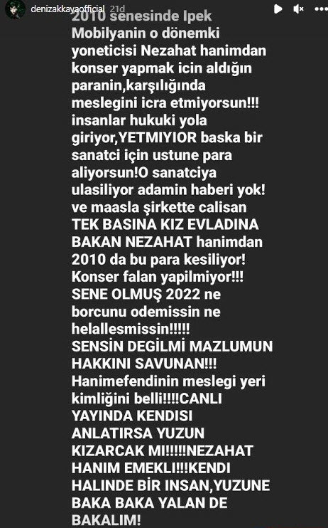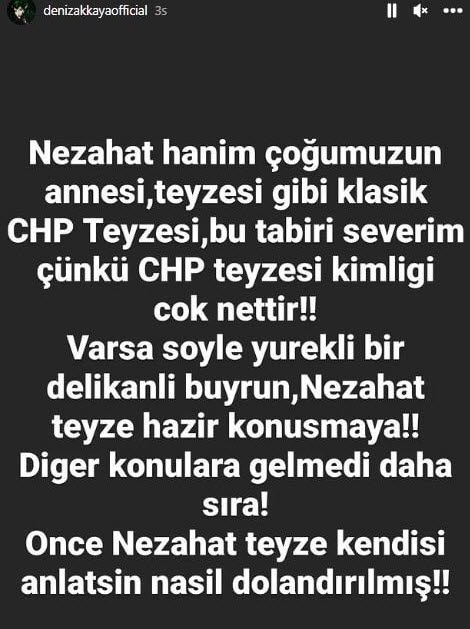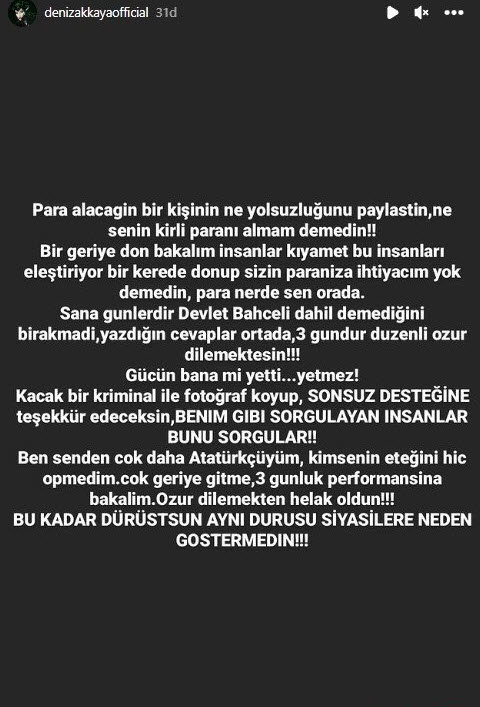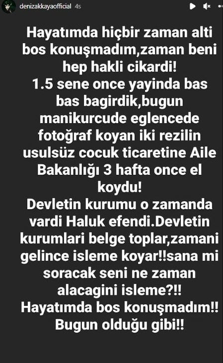 Deniz Akkaya AHBAP Derneği kurucusu Haluk Levent'le ilgili ifşalarına devam etti. Sosyal medyadan yaptığı zehir zemberek açıklamalarda "İki ay öncesinde dolandırdığın insanlar yayına çıkmak için bekliyor. Az kaldı hazırlan" diyen Akkaya Haluk Levent'in kendisine dava açması sonrası yeniden açıklamalarda bulundu. "Gücü bana mı yetti, yetmez!" diyen Deniz Akkaya, Haluk Levent'in dolandırdığı insanları açıkladı. 'Hodri medyan' diyen ünlü isim, "Beyefendide varsa o yürek çıkıp yüzleşsin" şeklinde konuştu. İşte Deniz Akkaya'nın ortalığı karıştıran yeni iddiaları...