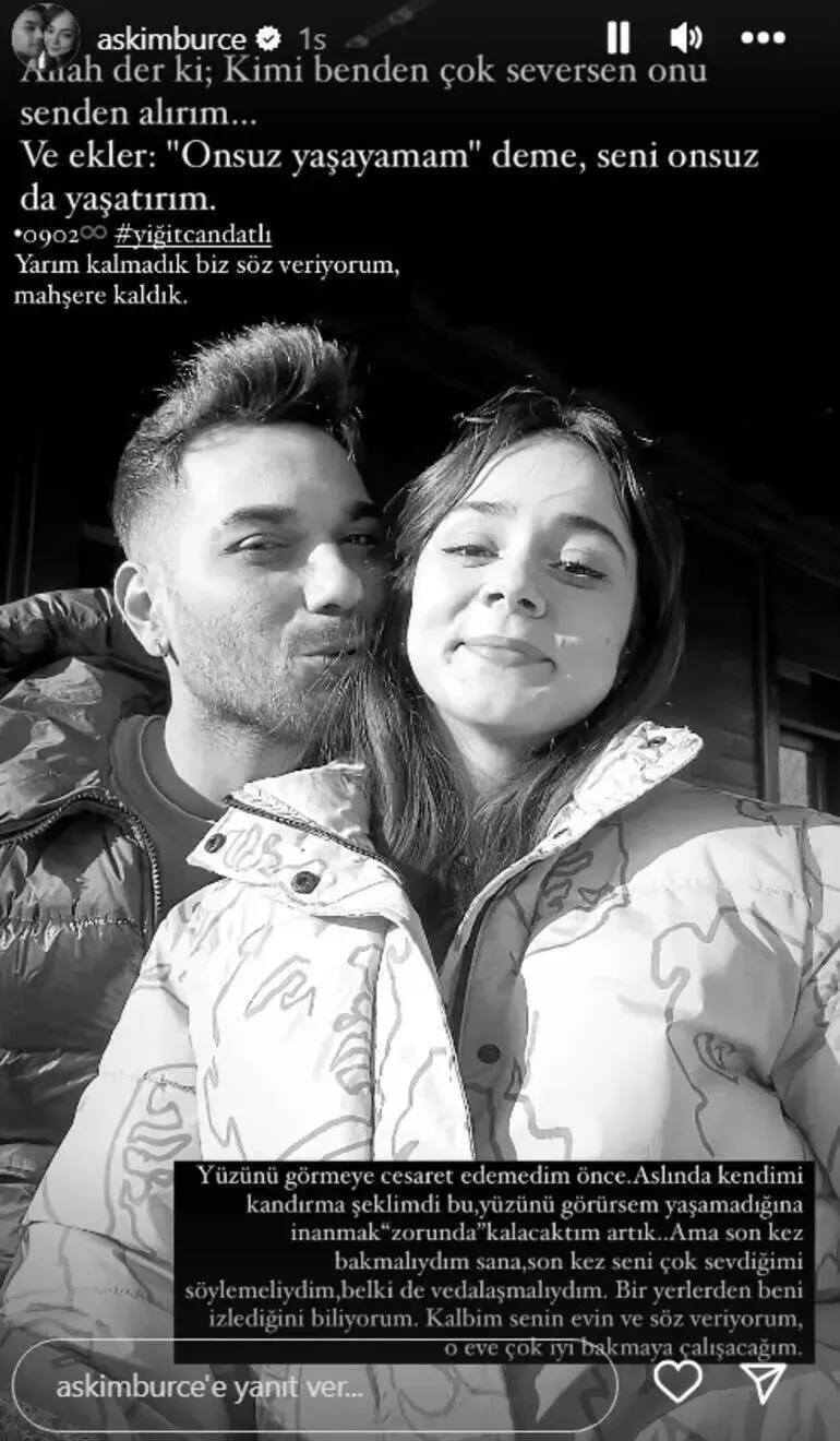 "Ölüm değilse bizi ayıran; yazık olmuş." cümlesi ile bir gönderi yayınlayan Burçe sevgilisini kaybetmesinin üzerinden iki hafta geçtiğini açıkladı.