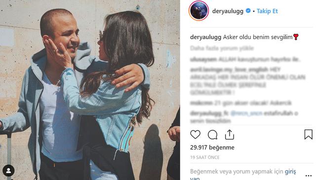 Derya Uluğ sevgilisi Asil Gök'ü askere uğurladı. Kendisi gibi müzisyen olan Asil Gök ile fotoğrafını Instagram hesabından paylaşan Derya Uluğ, "Asker oldu benim sevgilim" notunu düştü. Derya Uluğ hayranları yapılan paylaşımı beğeni yağmuruna tuttu.