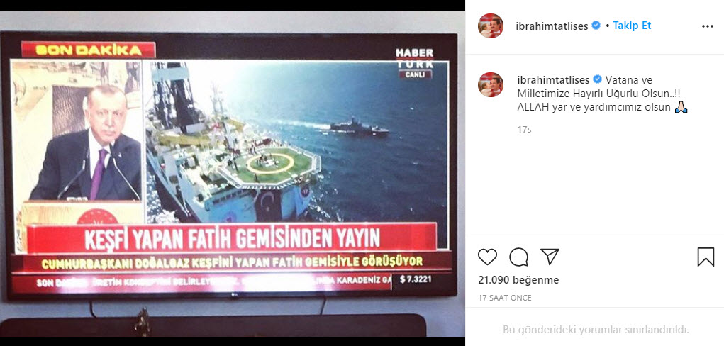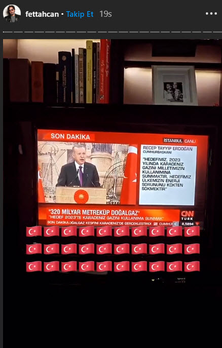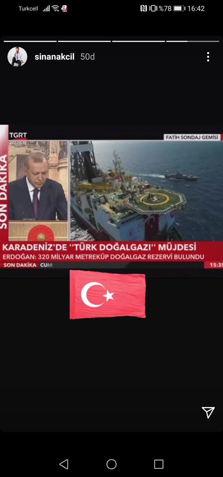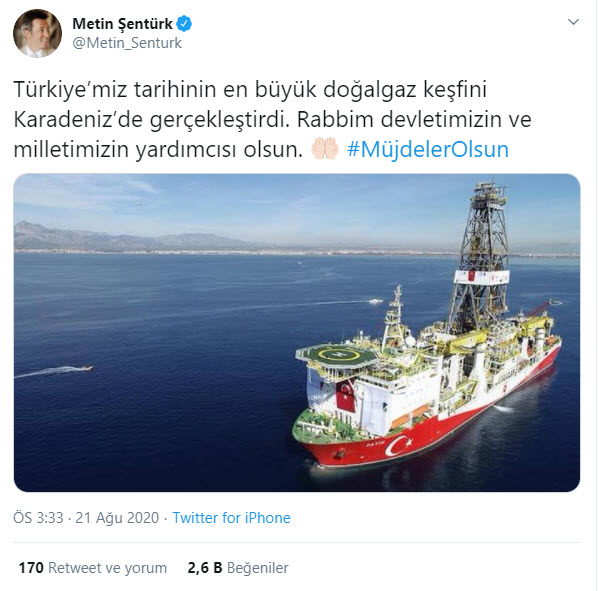 "Türkiye'miz tarihinin en büyük doğal gaz keşfini Karadeniz'de gerçekleştirdi. Rabbim devletimizin ve milletimizin yardımcısı olsun."