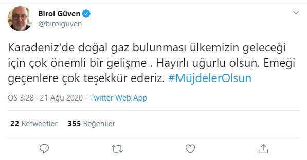 "Karadeniz'de doğal gaz bulunması ülkemizin geleceği için çok önemli bir gelişme. Hayırlı uğurlu olsun. Emeği geçenlere çok teşekkür ederiz."