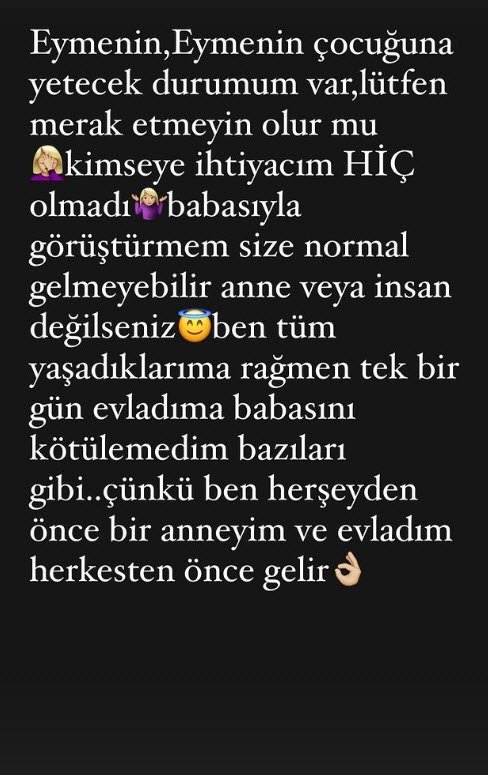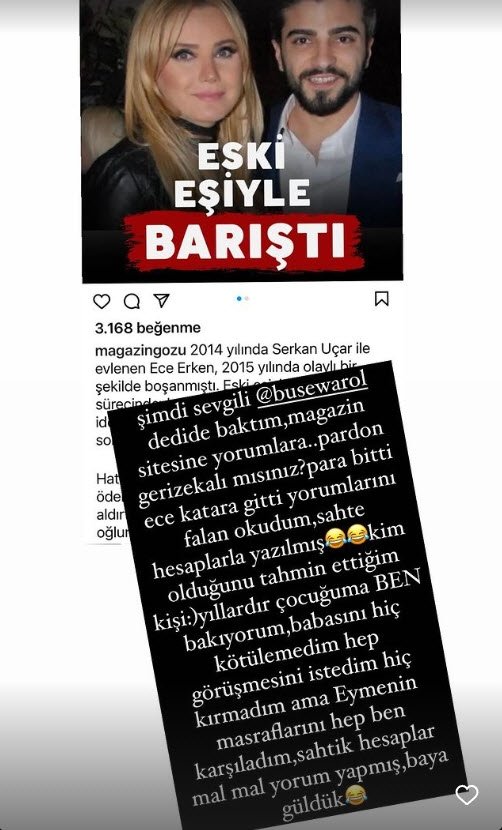 Haklarında çıkan bir barışma haberini Instagram hesabından paylaşan Erken, şu ifadeleri kullandı: "Pardon, geri zekalı mısınız? 'Para bitti, Ece Katar'a gitti' yorumlarını falan okudum, sahte hesaplardan yazılmış. Kim olduğunu tahmin ettiğim kişi. Yıllardır çocuğuma ben bakıyorum, babasını hiç kötülemedim hep görüşmesini istedim. Hiç kırmadım ama Eymen'in masraflarını hep ben karşıladım. Sahte hesaplar mal mal yorum yapmış, baya güldük."