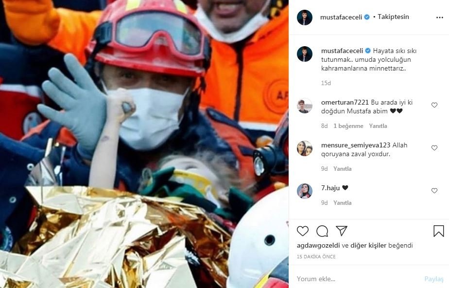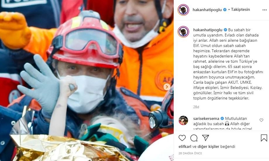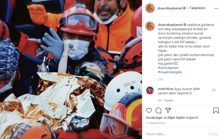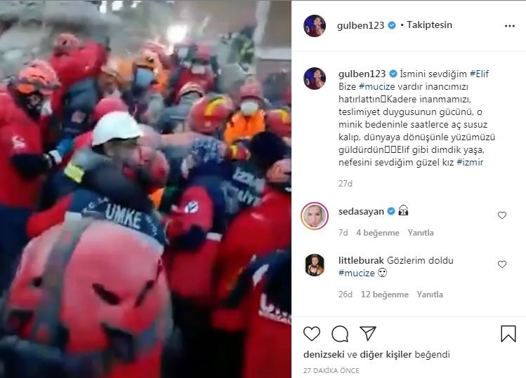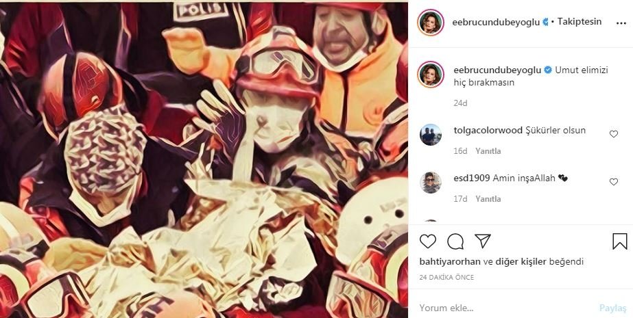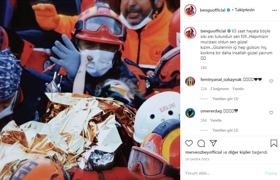 İzmir'de yaşanan şiddetli deprem sonrası yıkılan Doğanlar Apartmanı'nda mucize bir kurtuluş gerçekleşti. Enkaz altında kalan 3 yaşındaki Elif Perinçek, 65 saat sonra yaralı olarak kurtarıldı. Ünlü isimler de mutluluklarını sosyal medya hesaplarından yaptıkları paylaşımlarla dile getirdi. İşte o paylaşımlar...