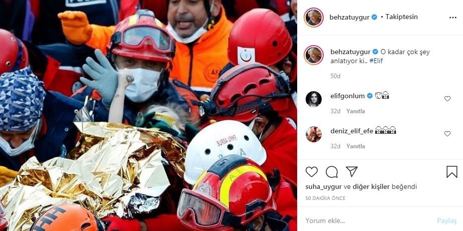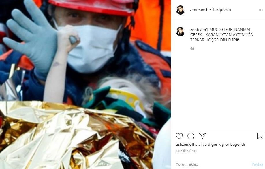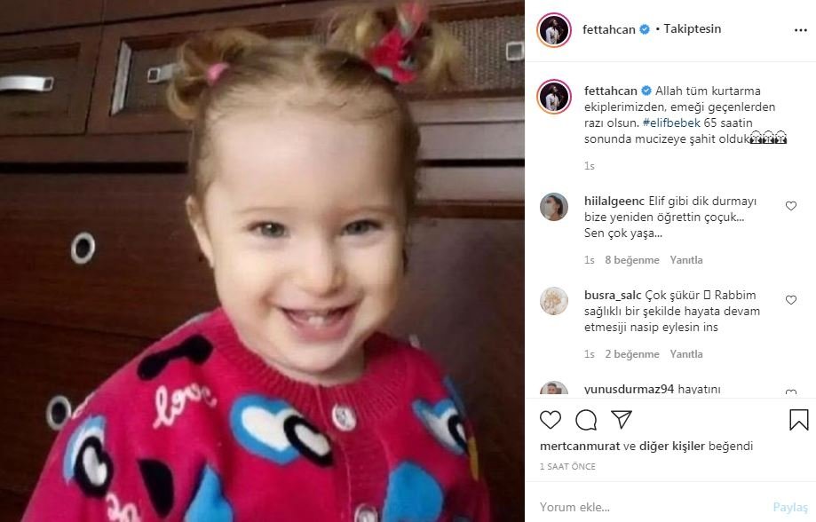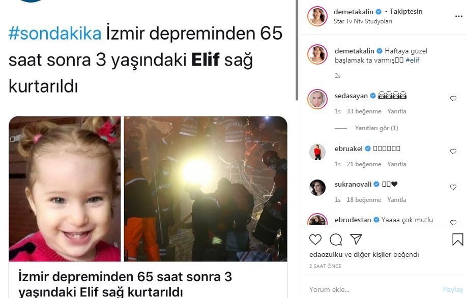 İzmir'in Seferihisar ilçesinde yaşanan 6.6 büyüklüğündeki depremde yıkılan Doğanlar Apartmanı'nda enkaz altında kalan 3 yaşındaki Elif 65 saat sonra enkaz altından çıkarıldı. Mucize kurtuluş tüm Türkiye'yi sevince boğdu. Ünlü isimler ise yaşadıkları sevinci sosyal medya hesaplarından paylaştı. İşte ünlülerin o paylaşımlar...