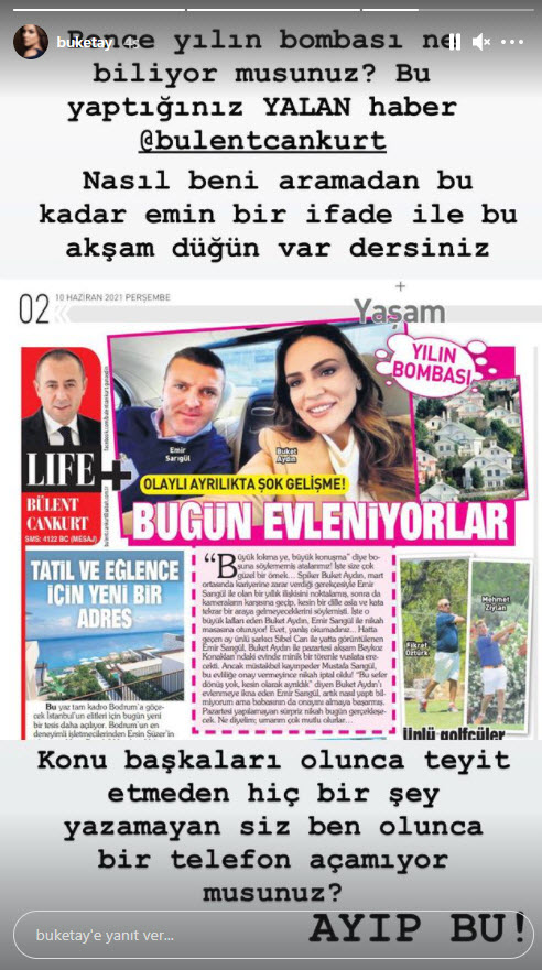 Geçtiğimiz haftalarda Sibel Can'la yatta yakalanan Emir Sarıgül'le ilgili bomba bir haber gündeme geldi. İkilinin görüntülerinin çıkmasının ardından basına konuşan Buket Aydın, kariyerine zarar verdiği gerekçesiyle Emir Sarıgül ile olan bir yıllık ilişkisini noktaladığını ve kendisiyle evlenmek istemediğini açıklamıştı. Sarıgül'ün bugün eski sevgilisi Buket Aydın ile nikah masasına oturacağı iddia edildi. Magazin gündemine bomba gibi düşen haberi Sabah yazarı Bülent Cankurt köşesinden duyurdu. Buket Aydın, sosyal medyadan yaptığı paylaşımla iddialara cevap verdi.