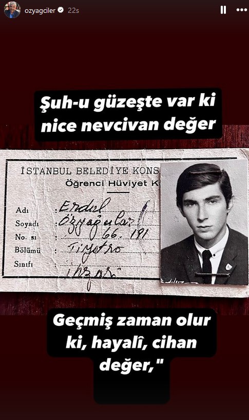 76 yaşındaki usta oyuncu, İstanbul Belediye Konservatuarı Tiyatro Bölümü'nde eğitim aldığı yıllara ait eski öğrenci kimliğini Instagram'dan paylaştı.