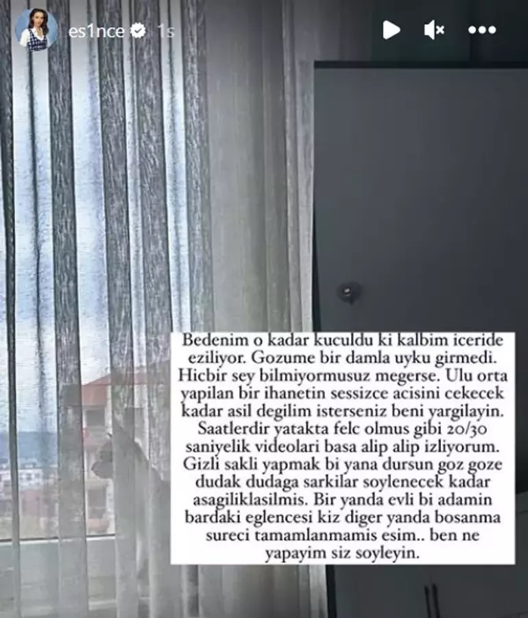 "Bedenim o kadar küçüldü ki kalbim içeride eziliyor. Gözüme bir damla uyku girmedi. Hiçbir şey bilmiyormuşuz meğerse. Ulu orta yapılan ihanetin sessizce acısını çekecek kadar asil değilim, isterseniz beni yargılayın.