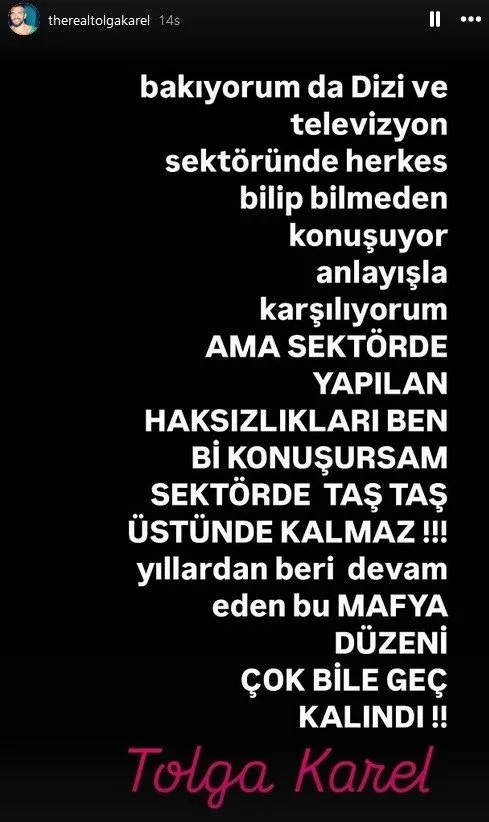 Yaprak Dökümü'nde Oğuz karakteriyle yıldızı parlayan Tolga Karel, Ayşe Barım hakkında çıkan iddiaların ardından sosyal medya hesabından yaptığı çıkışla dikkatleri üzerine çekti. Karel, "Ben konuşursam taş taş üstünde kalmaz" sözleriyle büyük yankı uyandırdı. Dizi sektöründeki tekelleşmeye yönelik isyanını da sıkça dile getiren Karel, son açıklamalarıyla da gündeme oturdu.