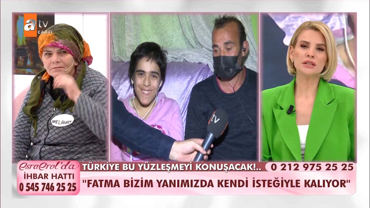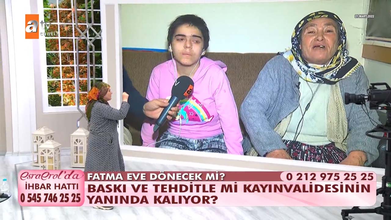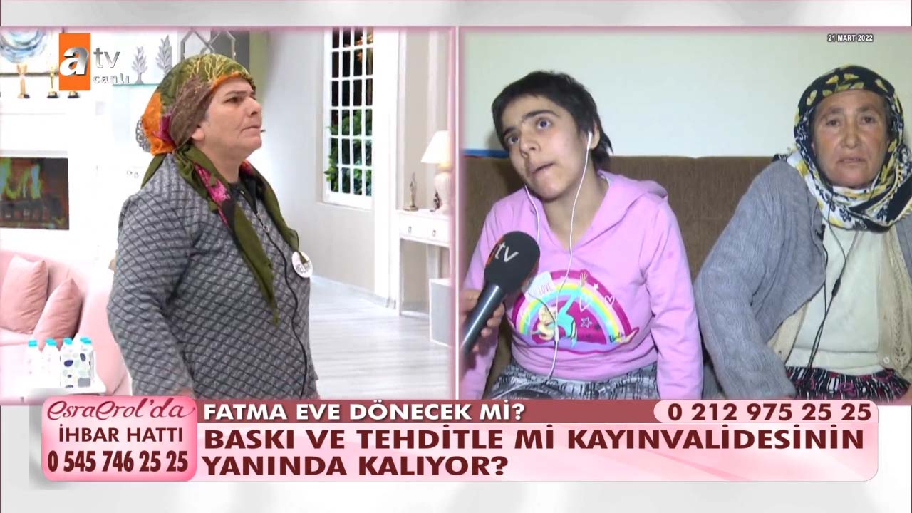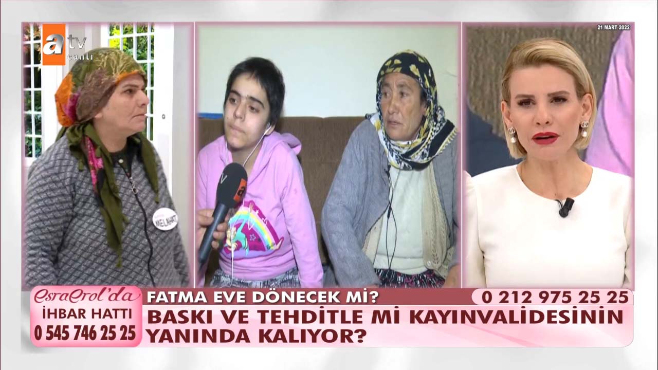 Atv ekranlarında izlenme rekorları kıran Esra Erol'da programına 19 yaşındaki zihinsel engelli Fatma damga vurdu. Türkiye'nin yakından takip ettiği Fatma ve anne Melahat Oruç arasındaki diyalog herkesi şaşırttı. Esra Erol'da bugün yaşanan son gelişmelerde ise kızına dön çağrısı yapan Melahat Oruç, kızı Fatma'ya dön çağrısı yaptı. Fatma'nın sözleri ise Esra Erol'da canlı yayınına damga vurdu. İşte 22 Mart Salı Esra Erol'da yaşanan son gelişmeler...