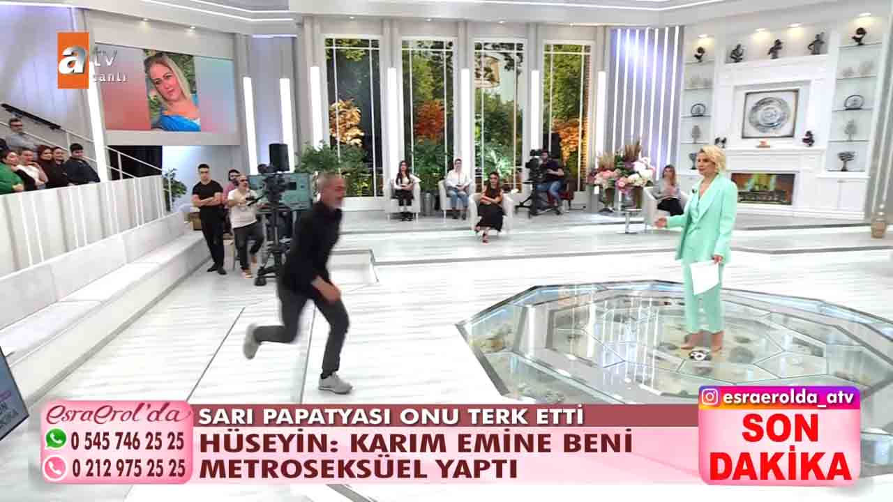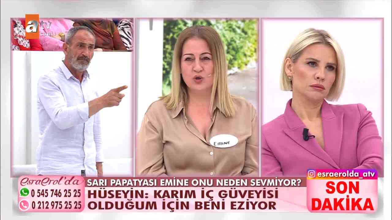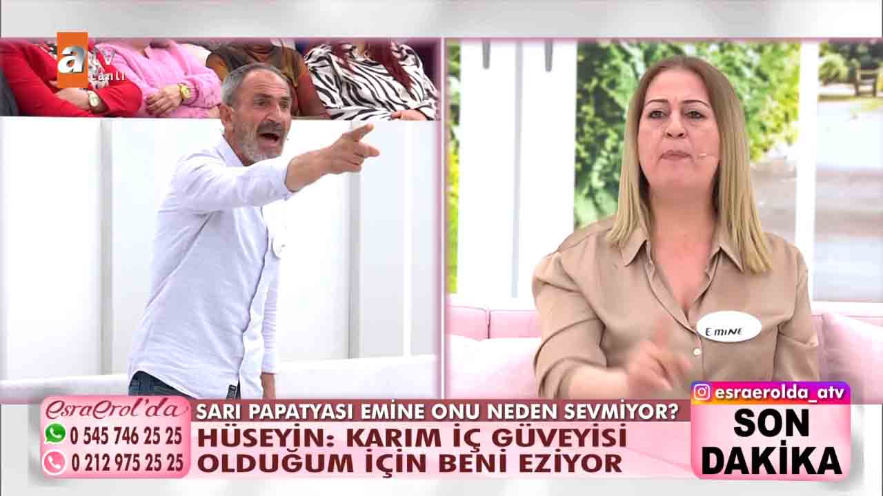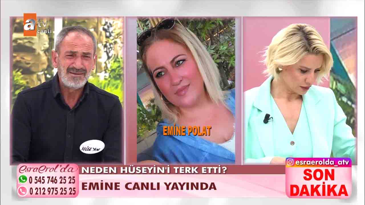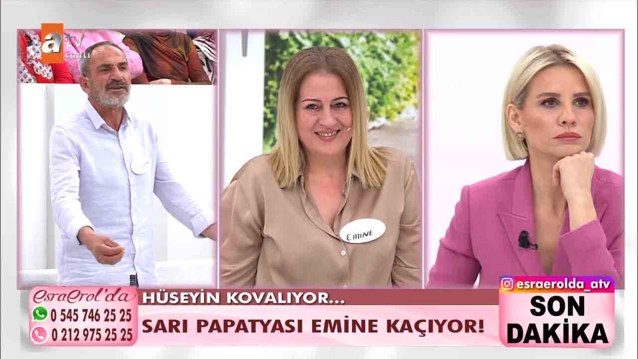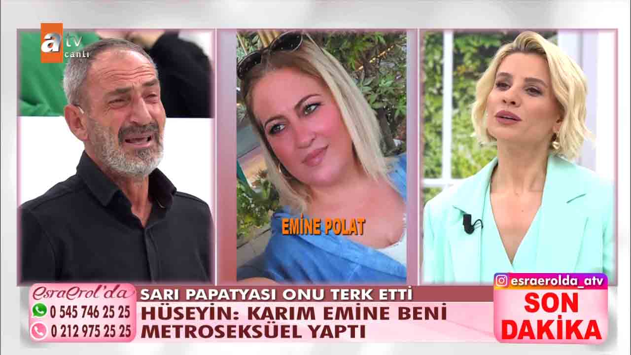 ATV'nin beğeniyle takip edilen programlarından 'Esra Erol'da', her hafta olduğu gibi bu hafta da izleyicileri ekran başına kilitledi. Esra Erol'un sunumuyla ekranlara gelen programda bugün yaşananlar güne damga vurdu. Getçğimiz günlerde programa katılan Hüseyin Polat bir yıl önce evlendiği karısı Emine Polat'ın evi terk ettiğini, karısıyla barışmak için programa geldiğini açıkladı. Esra Erol "Eşinizin kılık kıyafetiyle ilgili şikâyeti var mıydı?" diye sordu. Hüseyin Polat kendisini karısının giydirdiğini, bunca zaman krem bile sürmediğini karısının isteğiyle bakım yapmaya başladığını, krem sürdüğünü hatta babet çorap giydiğini anlattı. Yaşanan gelişmelerin ardından Hüseyin, Emine'nin projeksiyona yansıyan fotoğrafına koşarak, "Emine'm, geri dön. Ben sana ne yaptım? " diyerek hüngür hüngür ağladı. Bugün ise yeni gelişmeler yaşandı. 'Sarı Papatyam' dediği eşi bugün canlı yayına çıktı. Ancak eşler arasında sinirler gerildi. Stüdyoda birbiri üzerine yürüyen eşleri görevliler ayırdı.