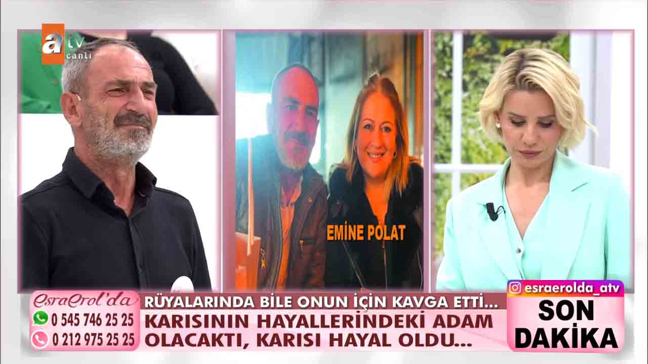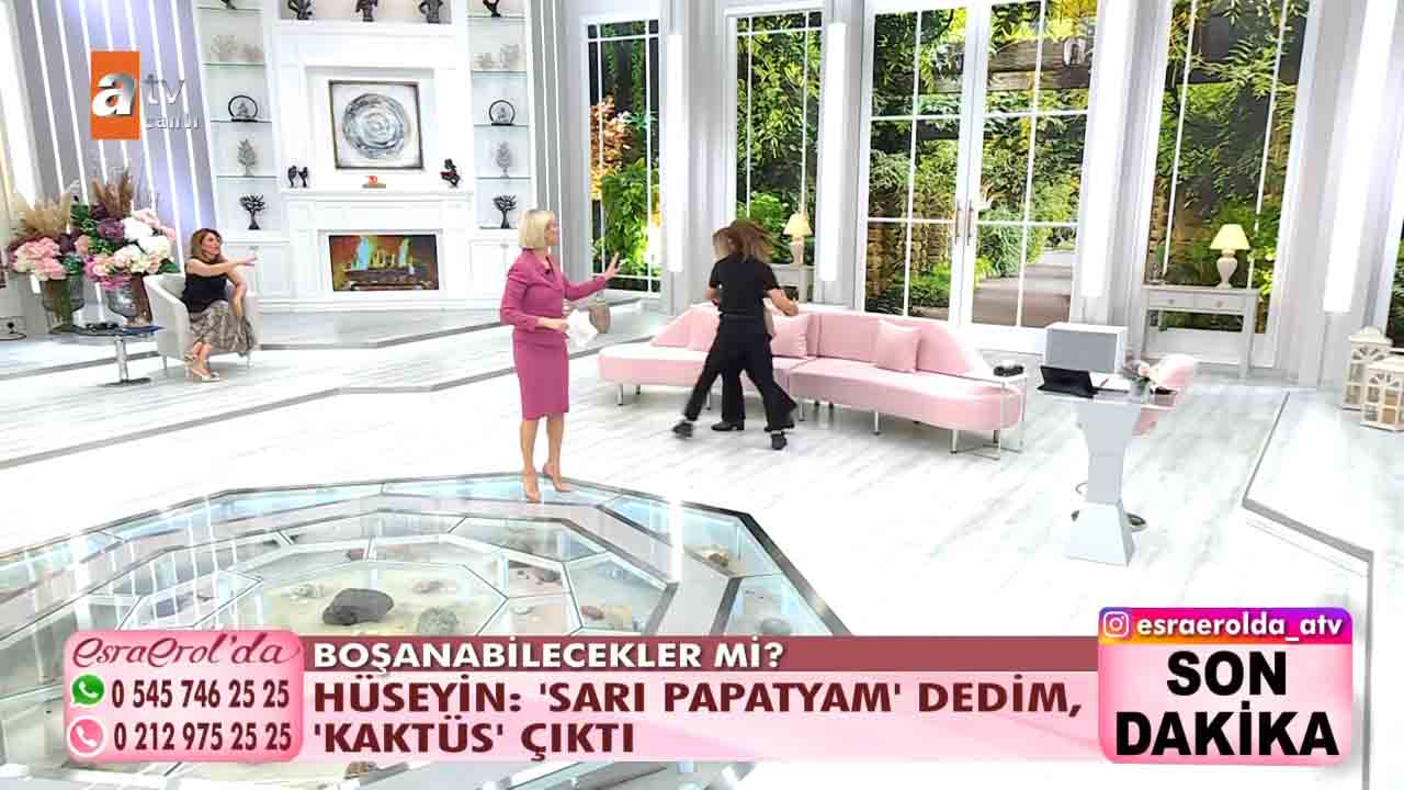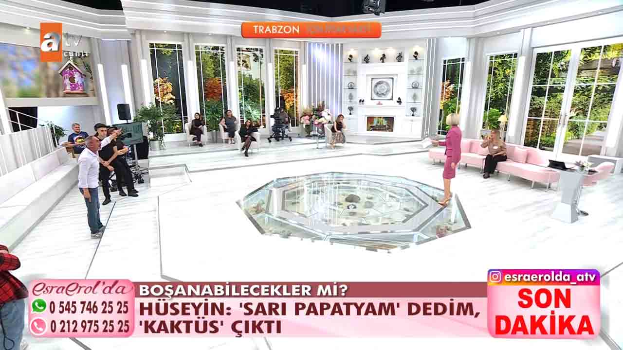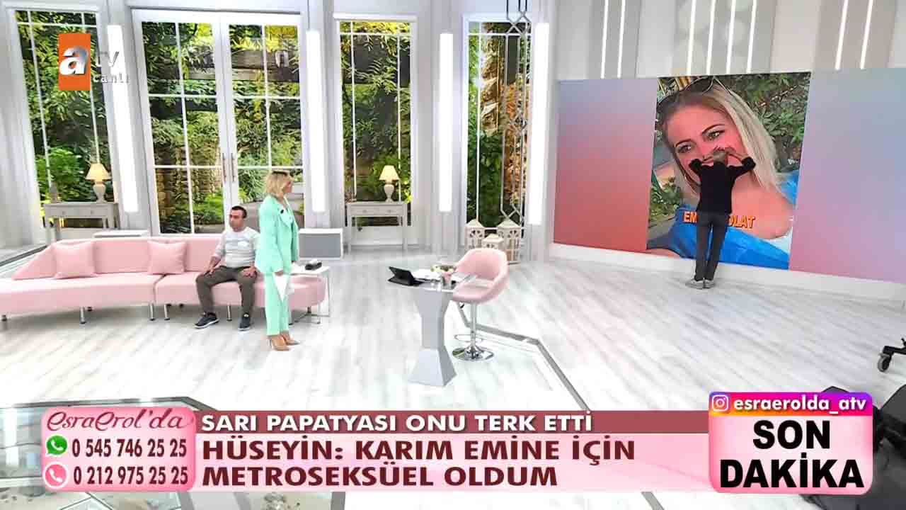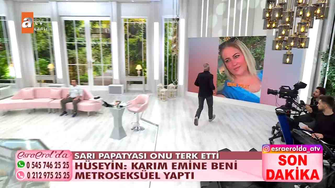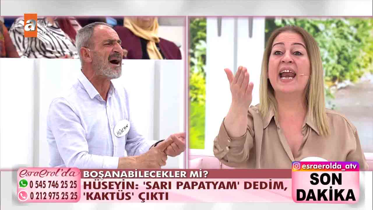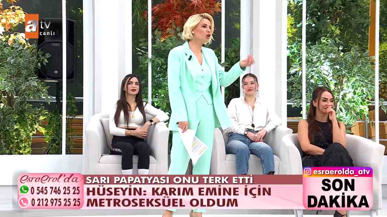 ATV'nin beğeniyle takip edilen programlarından 'Esra Erol'da', her hafta olduğu gibi bu hafta da izleyicileri ekran başına kilitledi. Esra Erol'un sunumuyla ekranlara gelen programda bugün yaşananlar güne damga vurdu. Getçğimiz günlerde programa katılan Hüseyin Polat bir yıl önce evlendiği karısı Emine Polat'ın evi terk ettiğini, karısıyla barışmak için programa geldiğini açıkladı. Esra Erol "Eşinizin kılık kıyafetiyle ilgili şikâyeti var mıydı?" diye sordu. Hüseyin Polat kendisini karısının giydirdiğini, bunca zaman krem bile sürmediğini karısının isteğiyle bakım yapmaya başladığını, krem sürdüğünü hatta babet çorap giydiğini anlattı. Yaşanan gelişmelerin ardından Hüseyin, Emine'nin projeksiyona yansıyan fotoğrafına koşarak, "Emine'm, geri dön. Ben sana ne yaptım? " diyerek hüngür hüngür ağladı. Bugün ise yeni gelişmeler yaşandı. 'Sarı Papatyam' dediği eşi bugün canlı yayına çıktı. Ancak eşler arasında sinirler gerildi. Stüdyoda birbiri üzerine yürüyen eşleri görevliler ayırdı.