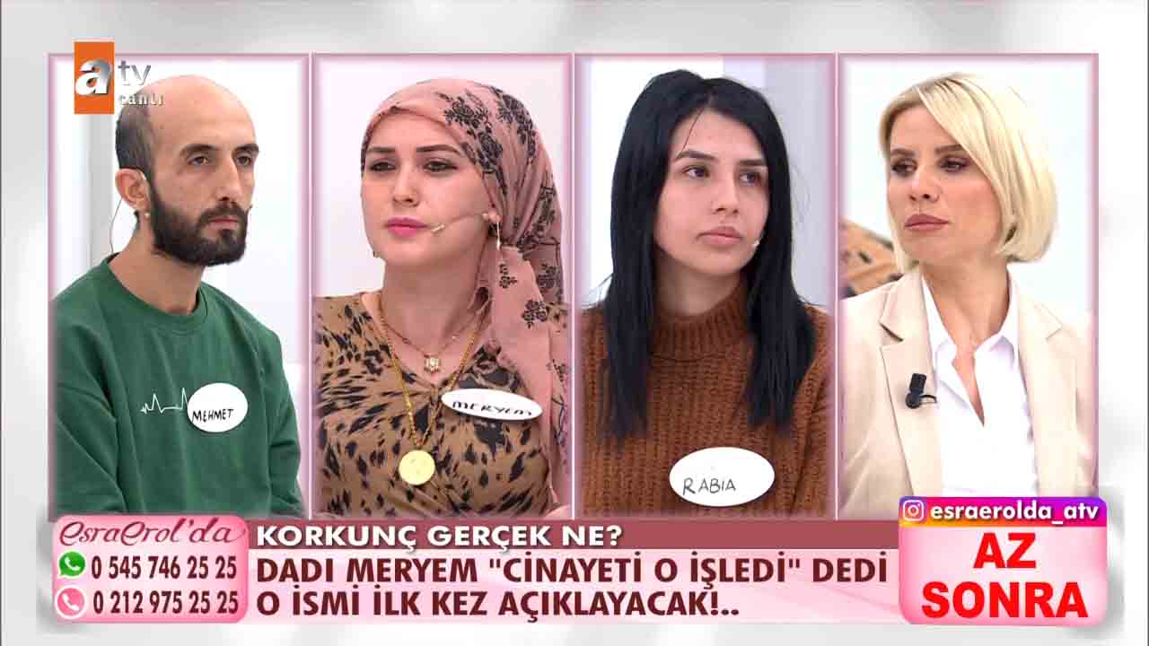 ATV'nin beğeniyle takip edilen programlarından 'Esra Erol'da', her hafta olduğu gibi bu hafta da izleyicileri ekran başına kilitledi. Esra Erol'un sunumuyla ekranlara gelen programda yaşananlar adeta kan dondurdu. 6 yıldır birlikte olduğu eşini alddattığı için pişman olan ve barışmak isteyen Mehmet Altun programa başvurdu. Mehmet Altun'un eşini aldattığı dadı Meryem'in 8 yaşındaki Hasret Karakoç'u öldürdüğü ortaya çıktı. Cinayeti işlediğinde 17 yaşında Serkan adlı bir erkek olan Meryem'in hapisten çıktıktan sonra cinsiyetini değiştirdiği öğrenildi. İşte Esra Erol'da programına damga vuran o kan donduran olayın detayları...