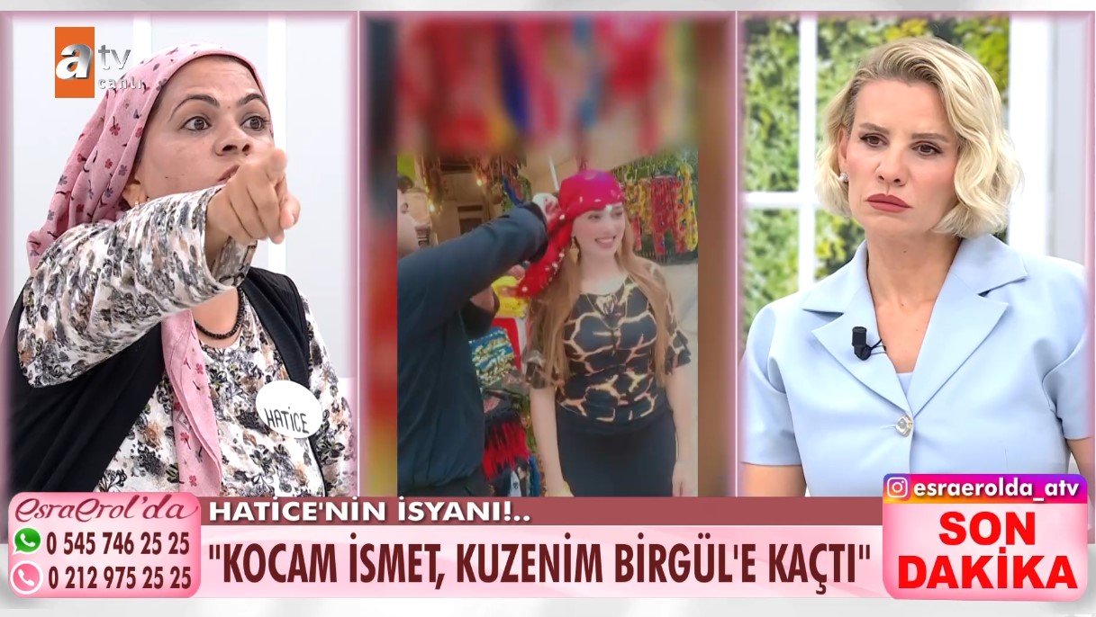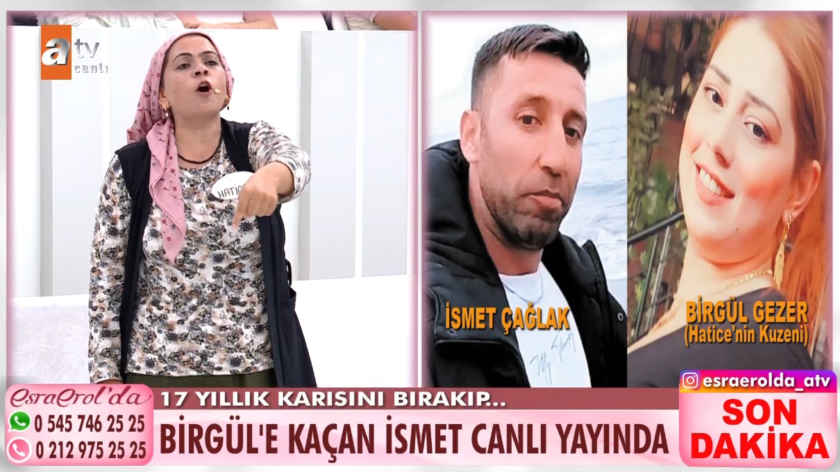 17 yıllık evli Hatice ve İsmet çifti arasında yaşanan olay Esra Erol'un programına taşındı. 3 çocuk annesi Hatice eşi İsmet'in define aramaya diye çıktığını ancak kuzenine kaçtığını söyledi. Hatice, 13 eylül günü kocasının Konya'ya gideceğini, o gün Birgül'ü sevdiğini kendisine söylediğini belirtti. Hatice durumu 20 Eylül'de Birgül'ün ailesine söylediğini belirterek İsmet ve Birgül'ün 21 eylül tarihinde beraber kaçtığını iddia etti. İsmet ve kaçtığı iddia edilen Birgül canlı yayına bağlandı ve taraflar yüzleşti. Tansiyonun yükseldiği anlarda İsmet'in savunması Hatice'yi sinirlendirdi.
