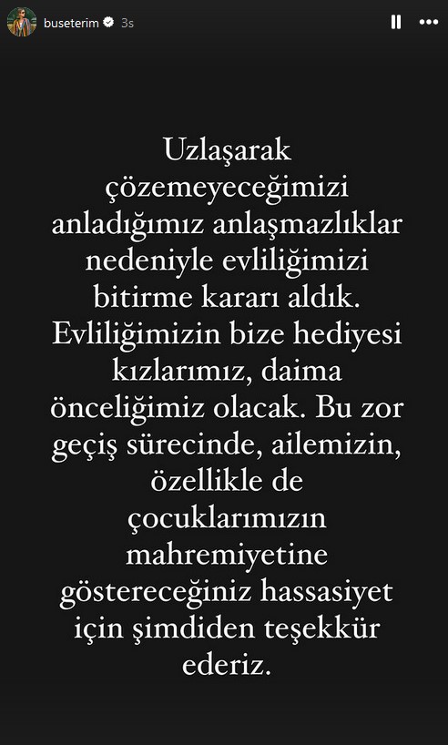 "Uzlaşarak çözemeyeceğimizi anladığımız anlaşmazlıklar nedeniyle evliliğimizi bitirme kararı aldık. Evliliğimizin bize hediyesi kızlarımız, daima önceliğimiz olacak. Bu zor geçiş sürecinde ailemizin özellikle de çocuklarımızın mahremiyetine göstereceğiniz hassasiyet için şimdiden teşekkür ederiz."