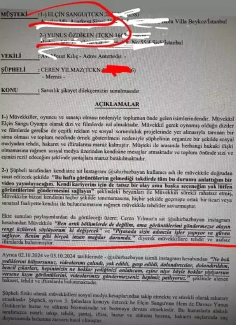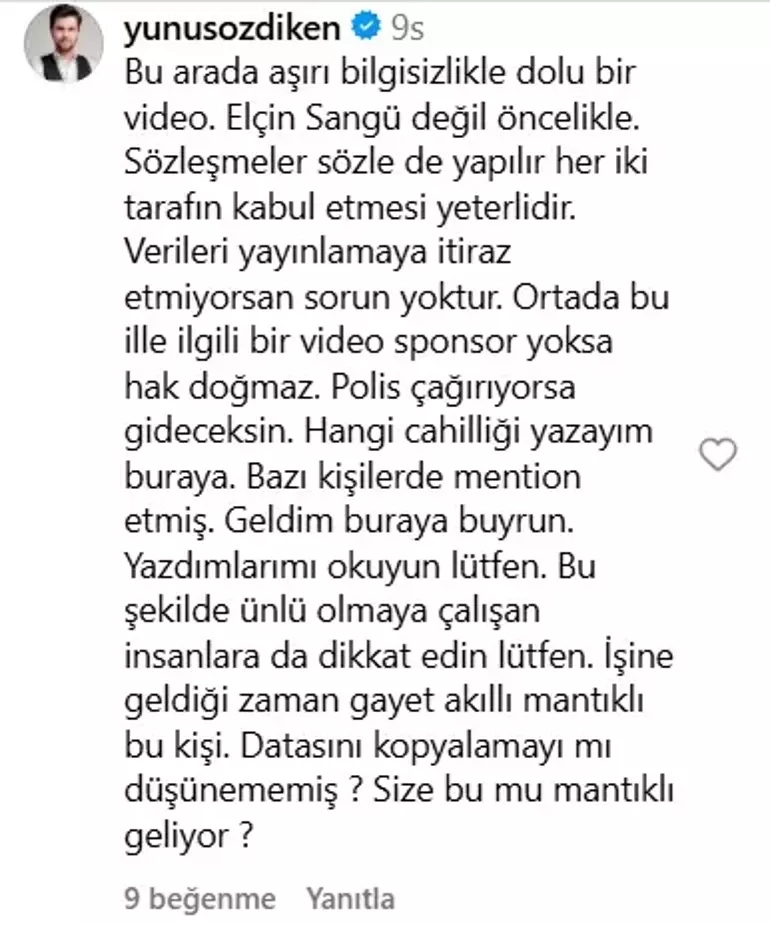 Elçin Sangu ve sevgilisi Yunus Özdiken'in kendisine dava açtığını belirten isim şu ifadeleri kullandı: "Görüntü davasıyla ilgili bana bir kağıt geldi ve Türkiye'ye çağırılıyorum ifade verebilmem için... Ben bu insanların isimlerini vermeyeyim diye tehdit ediliyorum. İşlerime taş koyuyorlar"