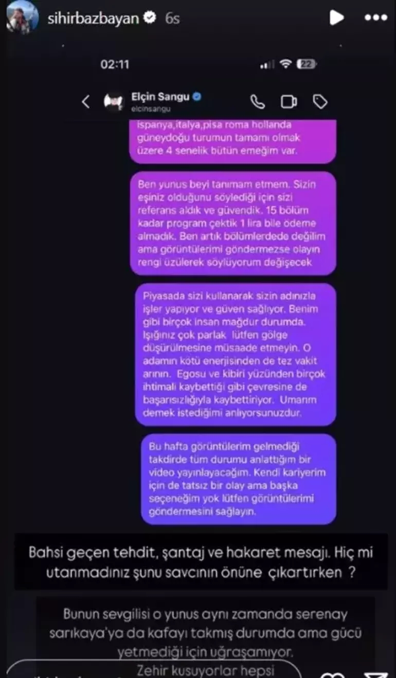 "Sihirbazbayan" adıyla tanınan fenomen Ceren Yılmaz, Elçin Sangu ve sevgilisi Yunus Diken hakkında çarpıcı iddialar ortaya attı. Sosyal medya hesabından bir video yayınlayan Yılmaz, ikili için, "Beni evimden aldırdılar" dedi. Bunun üzerine Sangu'nun sevgilisi de konuyla ilgili ilk kez açıklama yaptı.