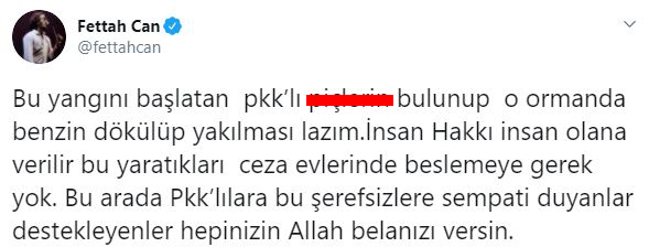 "Bu yangını başlatan pkk'lı p... bulunup o ormanda benzin dökülüp yakılması lazım.İnsan Hakkı insan olana verilir bu yaratıkları ceza evlerinde beslemeye gerek yok. Bu arada Pkk'lılara bu şerefsizlere sempati duyanlar destekleyenler hepinizin Allah belanızı versin".