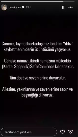 Yıldız'ın vefat haberini meslektaşı ünlü oyuncu Caner Topçu, Instagram hesabından paylaştı.