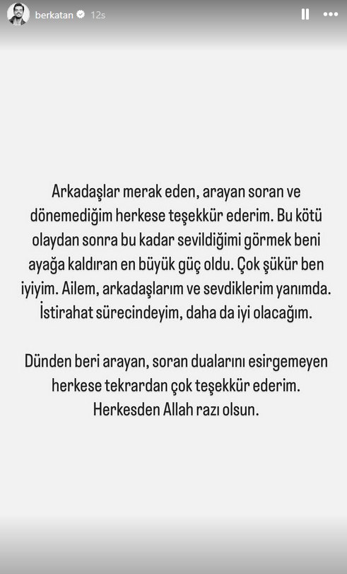 Gönül Dağı dizisinin başrolü Berk Atan, dün geçirdiği kaza sonucu ölümden dönmüştü. İçinde bulunduğu aracın şarampole devrilmesi sonucu ağır yaralanan ünlü oyuncudan hayranlarını sevindiren haber geldi. Atan, sağlık durumu hakkında ilk kez sosyal medya hesabından açıklama yaptı.