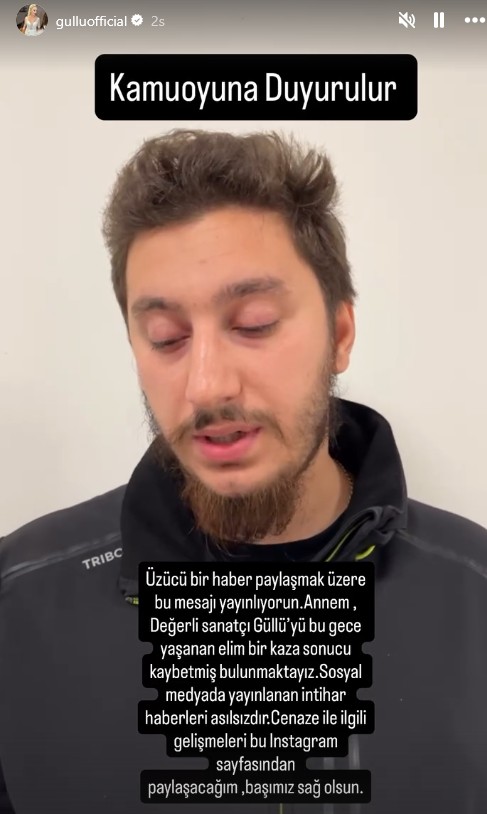 "Üzücü bir haberi paylaşmak üzere bu mesajı yayınlıyorum. Annem değerli sanatçı Güllü'yü bu gece yaşanan elim bir kaza sonucu kaybetmiş bulunmaktayız. Sosyal medyada yayınlanan intihar haberleri asılsızdır. Cenaze ile ilgili gelişmeleri buradan paylaşacağım. Başımız sağ olsun."