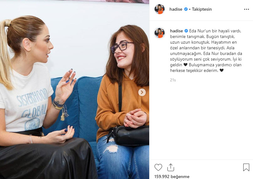 "Eda Nur'un bir hayali vardı, benimle tanışmak. Bugün tanıştık, uzun uzun konuştuk. Hayatımın en özel anlarından bir tanesiydi. Asla unutmayacağım. Eda Nur buradan da söylüyorum seni çok seviyorum. İyi ki geldin Buluşmamıza yardımcı olan herkese teşekkür ederim"
