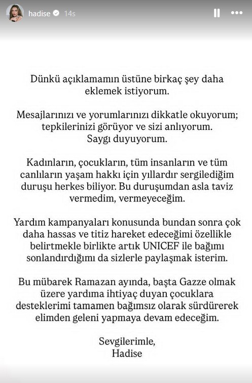 Kadınların, çocukların, tüm insanların ve tüm canlıların yaşam hakkı için yıllardır sergilediğim duruşu herkes biliyor. Bu duruşumdan asla taviz vermedim, vermeyeceğim. Yardım kampanyaları konusunda bundan sonra çok daha hassas ve titiz hareket edeceğimi özellikle belirtmekle birlikte artık UNICEF ile bağımı sonlandırdığımı da sizlerle paylaşmak isterim.