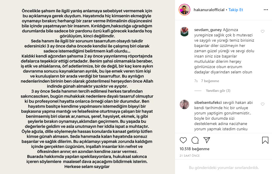 "Hayatımda hiç kimsenin ekmeğiyle oynamayı bırakın; herhangi bir zarar verme ihtimalinin düşüncesini bile içinde yaşatmayan bir insanım. Kırıldığım, haksızlığa uğradığım durumlarda bile sadece bir pardonu özrü kafi görecek kadar da hoş görülüyüm, kinci değilim. Seda Hanım ile ilgili bir sorunum tasarrufum olsaydı takdir edersiniz ki 3 ay önce daha önce de kendisi ile çalışmış biri olarak sadece istemediğimi belirtmem kafi olurdu..."