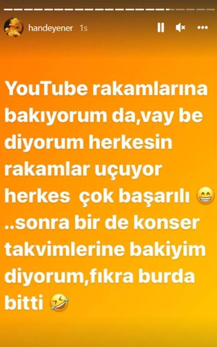 Paylaşımında "YouTube rakamlarına bakıyorum da, vay be diyorum. Herkesin rakamlar uçuyor, herkes çok başarılı. Sonra bir de konser takvimlerine bakayım diyorum, fıkra burada bitti" ifadelerini kullandı.
