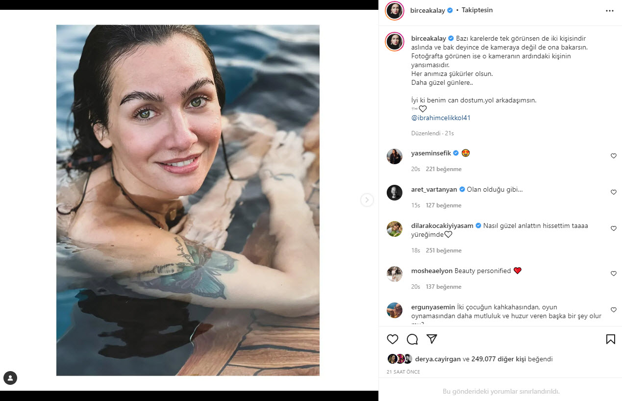 'Siyah Beyaz Aşk' dizisinin ardından 'Kuş Uçuşu' adlı yapımda da başrolü paylaşan Birce Akalay ve İbrahim Çelikkol, sosyal medyanın gündemine oturdu. Birlikte tatile çıkan ikili, yaptıkları paylaşımla aşk dedikodularına neden oldu. Ünlü oyuncu Birce Akalay, bugün yaptığı paylaşımla bu aşk iddialarına cevap verdi. İşte Birce Akalay'ın o paylaşımı...