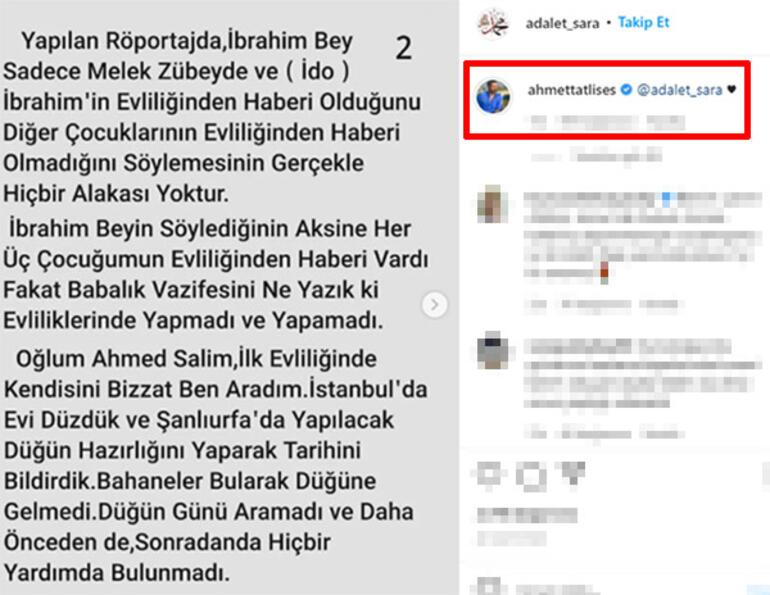 Oğlu İdo Tatlıses'in düğünü için servet harcadığı iddia edilen İbrahim Tatlıses, geçtiğimiz hafta verdiği bir röportajda, "İdo ve Melek Zübeyde dışında hiçbir çocuğumun düğününden haberim olmadı." dedi. Tatlıses'in sözleri sonra ilk eşi Adalet Sara'dan zehir zemberek açıklama geldi. Tatlıses'in çocukları için babalık görevini yerine getirmediğini söyleyen Adalet Sara, "Söylediğinin aksine her üç çocuğumun evliliğinden haberi vardı. Fakat babalık vazifesini ne yazık ki, evliliklerinde yapmadı" dedi.