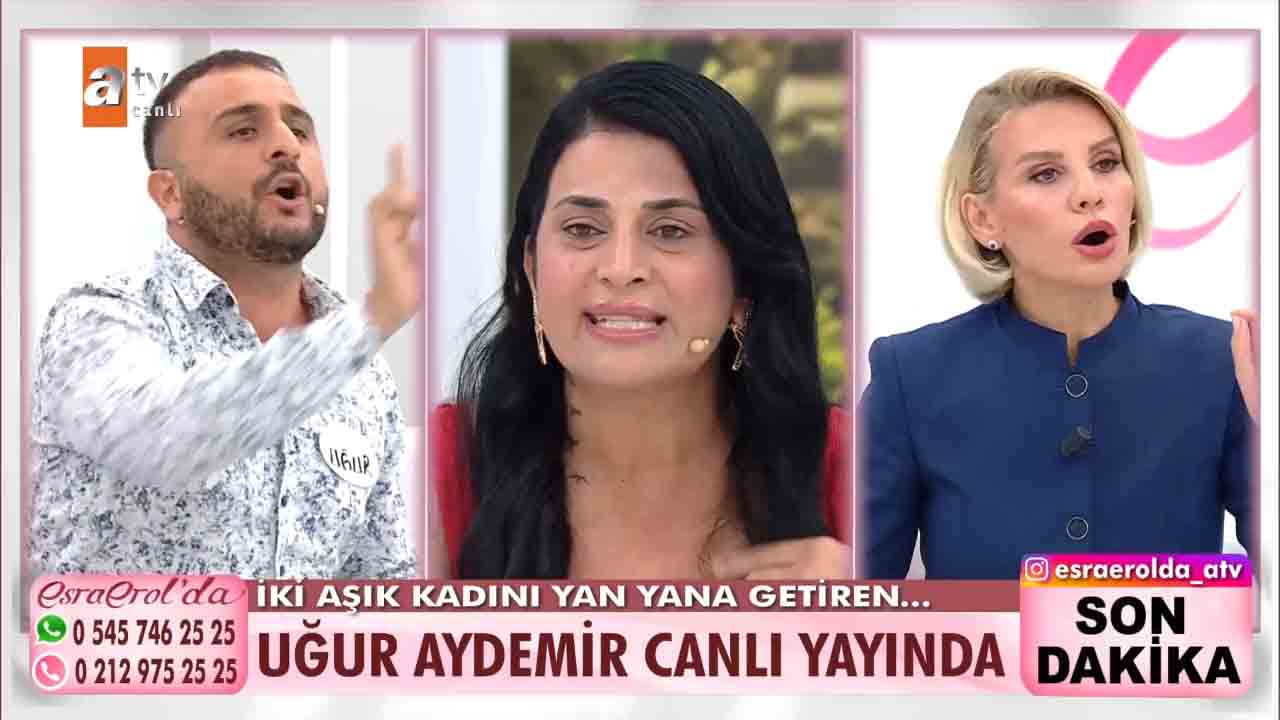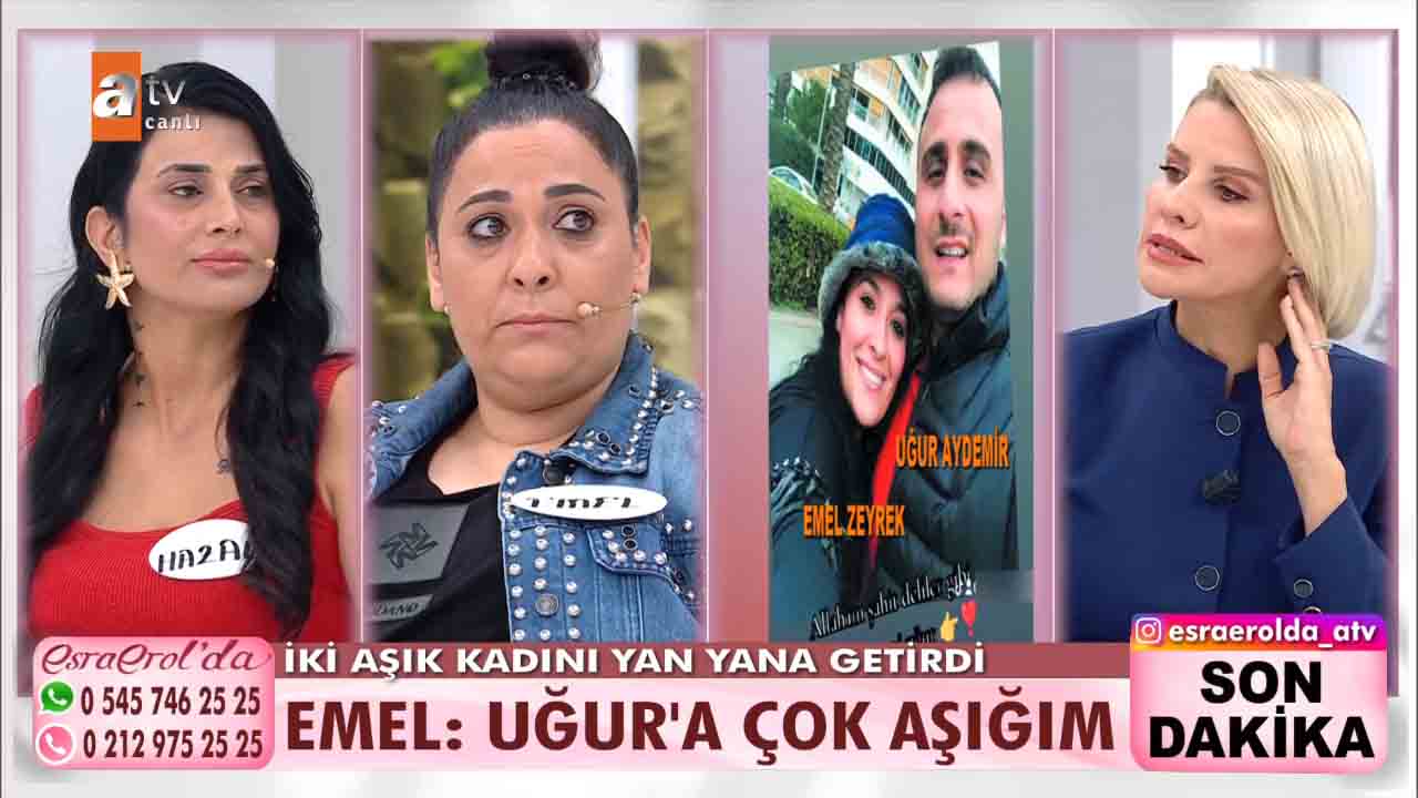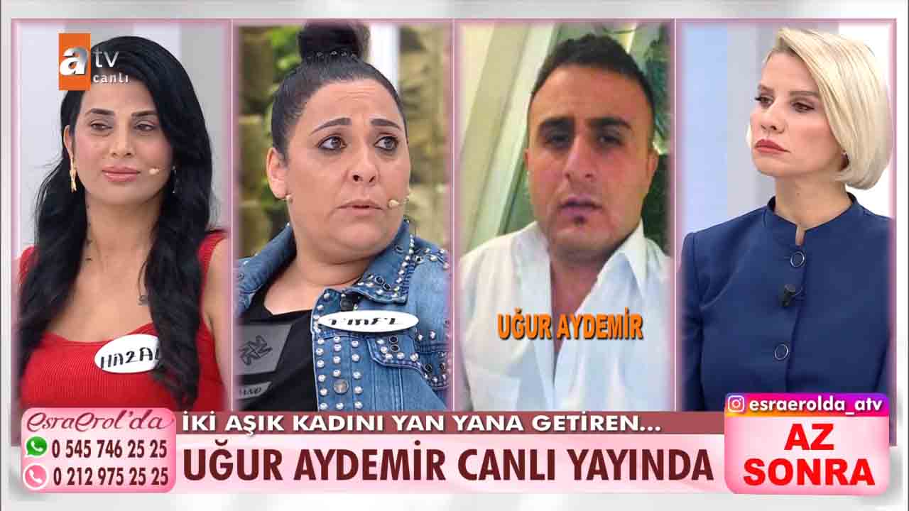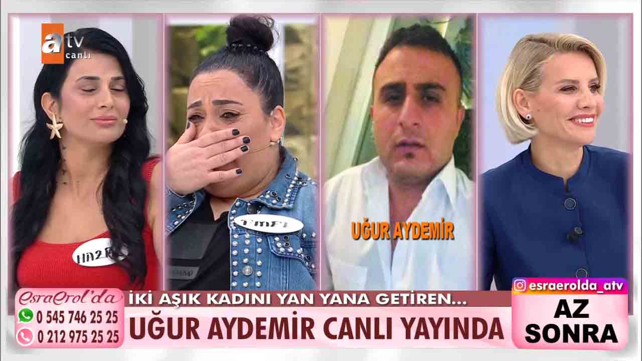 ATV'nin reyting rekortmeni programlarından biri olan Esra Erol'da bu hafta izleyicilerin büyük beğenisini kazandı. Ünlü sunucu Esra Erol'un sunumuyla ekranlara gelen programda her hafta farklı ve konuklar yer alıyor. Emel Zeyrek ve Hazal Kayma aynı adam Uğur Aydemir için stüdyoya geldi. Kadınlardan biri Uğur Aydemir'den hesap sorarken diğeri İlan-ı aşk etti. Hazal Hanım, Uğur Aydemir ile sevgili olduğunu ondan bir de çocuk yaptığını, Uğur'un hem kendisine hem de evladına bakmadığını, tam o sıralarda Emel'in Uğur'un hayatına girdiğini, başta Emel ile çok kavga ettiklerini ama şimdi kadın dayanışması yapmaya karar verdiklerini anlattı. İki aşık kadını yan yana getiren Uğur stüdyoya geldi. Çıkan gerilim sonrası taraflar birbirlerinin üzerine yürüdü. Uğur Aydemir'in rahat tavırları ise dikkatlerden kaçmadı. Esra Erol ise Aydemir'e tepki gösterdi.