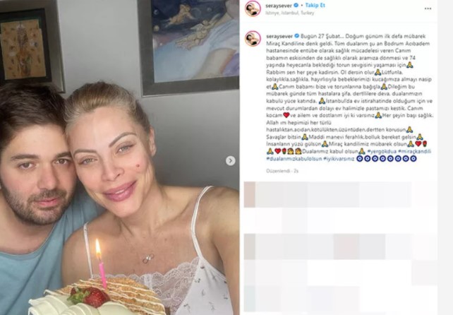 Ev haliyle pasta keserken fotoğraflarını paylaşan Seray Sever fotoğrafın altına şu notu düştü; "Bugün 27 Şubat… Doğum günüm ilk defa mübarek Miraç Kandili'ne denk geldi. Tüm dualarım şu an hastanede entübe olarak sağlık mücadelesi veren canım babamın eskisinden de sağlıklı olarak aramıza dönmesi ve 74 yaşında heyecanla beklediği torun sevgisini yaşaması için."
