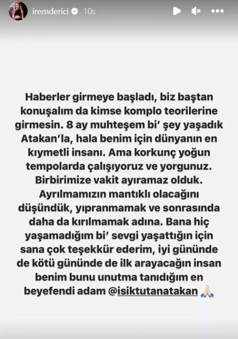 "Haberler girmeye başladı, biz baştan konuşalım da kimse komplo teorilerine girmesin. 8 ay muhteşem bi' şey yaşadık Atakan'la, hala benim için dünyanın en kıymetli insanı. Ama korkunç yoğun tempolarda çalışıyoruz ve yorgunuz. Birbirimize vakit ayıramaz olduk. Ayrılmamızın mantıklı olacağını düşündük, yıpranmamak ve sonrasında daha da kırılmamak adına. Bana hiç yaşamadığım bir sevgi yaşattığın için sana çok teşekkür ederim, iyi gününde de kötü gününde de ilk arayacağın insan benim bunu unutma tanıdığım en beyefendi adam."