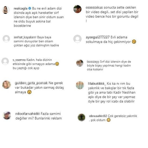 Canlı yayını izlerken ikili arasındaki samimiyetten rahatsız olan şarkıcı Çağla da sosyal medya hesabından tepki göstererek "Bu ne evli adam dizi dışında aşık aşık hareketler. Sırf izlensin diye ben sinir oldum şu an ne oldu büyük aşkına bel böceklerine" dedi.