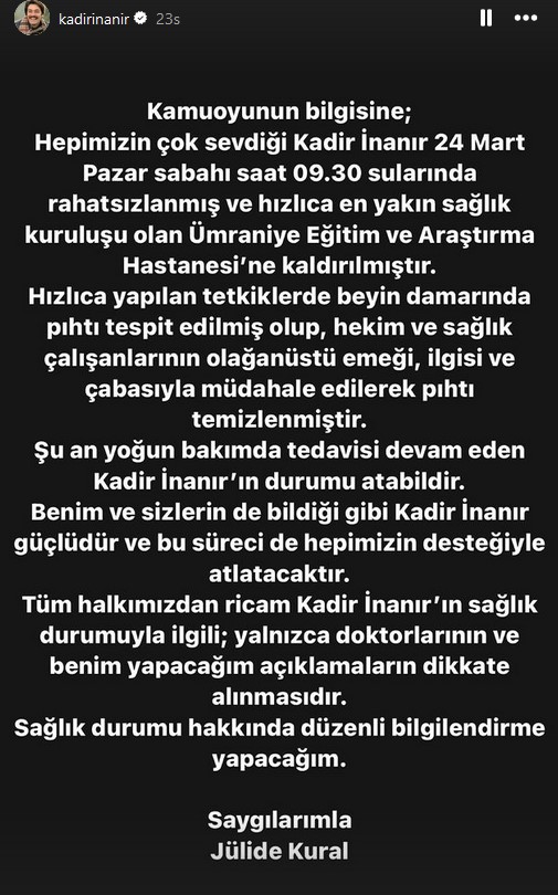 "Kamuoyunun bilgisine; bildiğiniz gibi hepimizin çok sevdiği Kadir İnanır, 24 Mart Pazar sabahı saat 09.30 sularında beyne giden damarlarında oluşan bir pıhtı nedeniyle Ümraniye Eğitim ve Araştırma Hastanesi'ne kaldırılmıştır. Doktorların önerisiyle 48 saat yoğun bakım sürecinde olacağı öngörülüyordu. Ancak siz halkımıza iyi haber vermek isterim. Bugün itibariyle tüm tetkik sonuçları olumlu çıktığından uyandırılma kararı alınmıştır.
