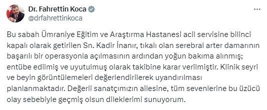 Bu sabah Ümraniye Eğitim ve Araştırma Hastanesi acil servisine bilinci kapalı olarak getirilen Sn. Kadir İnanır, tıkalı olan serebral arter damarının başarılı bir operasyonla açılmasının ardından yoğun bakıma alınmış; entübe edilmiş ve uyutulmuş olarak takibine karar verilmiştir.