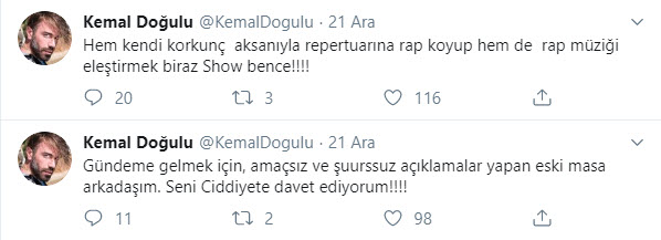 Tepkisini Twitter üzerinden dile getiren Doğulu, "Gündeme gelmek için amaçsız ve şuursuz açıklamalar yapan eski masa arkadaşım. Seni ciddiyete davet ediyorum. Hem kendi korkunç aksanıyla repertuvarına rap koyup, hem de eleştirmek biraz şov bence!" diyerek herkesi şaşırttı.