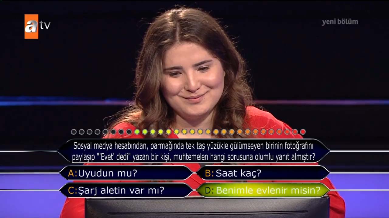 ATV'de izleyicisi ile buluşan Kim Milyoner Olmak İster yarışması, yeni bölümüyle dikkat çekti. Kenan İmirzalıoğlu'nun sunduğu rekortmen yarışma Kim Milyoner Olmak İster'in yayınlanan son bölümünde geceye bir yarışmacıya sorulan şiir sorusu damga vurdu.