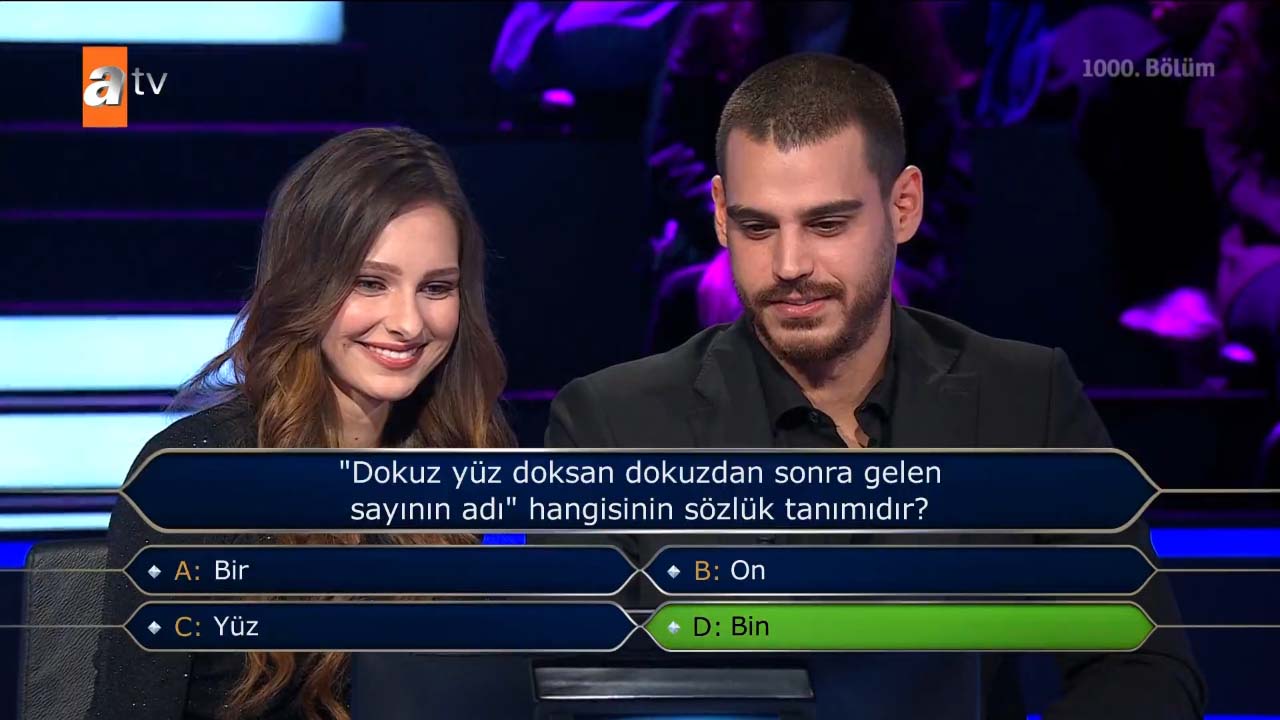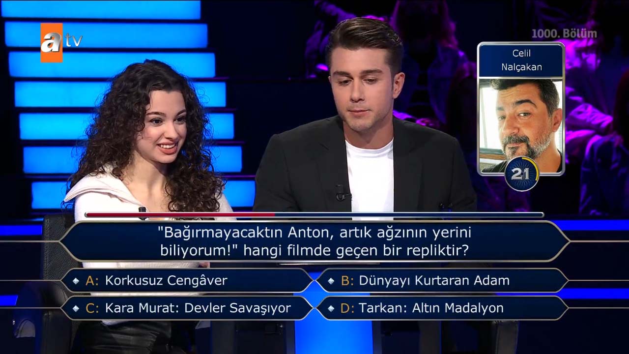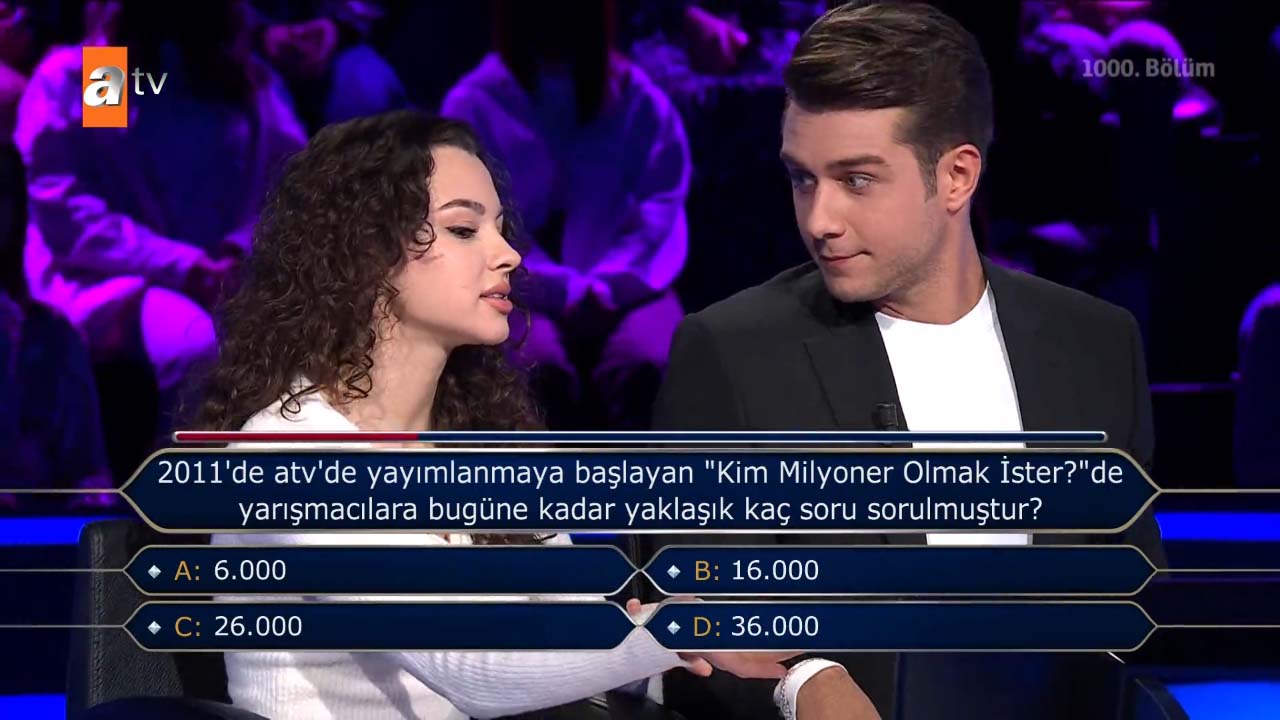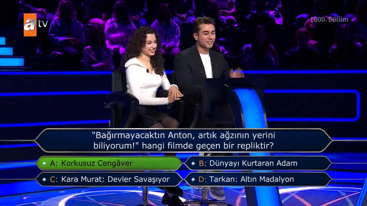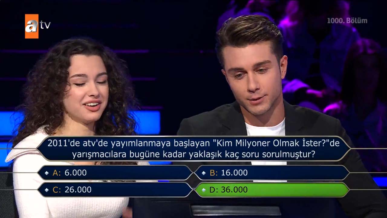 Ünlü ve yakışıklı oyuncu - sunucu Kenan İmirzalıoğlu'nun sunumuyla Atv'de fırtınalar gibi esen bilgi yarışması "Kim Milyoner Olmak İster?" 1000'inci programı ile ünlüleri ağırladı. Yalnız Kurt dizisinin 'MERYEM'i Brezilyalı oyuncu ve model Jessica May ile Yalnız Kurt dizisinin 'ALTAY'ı oyuncu Hasan Denizyaran, atv dizisi ALDATMAK'ın oyuncuları Feyza Sevil Güngör (Oylum Yenersoy ) ve Yusuf Çim (Ozan Yenersoy), diğer yandan yine Atv'de yayınlanan Kardeşlerim dizisinin genç ve başarılı oyuncuları "ASİYE" Su Burcu Yazgı Coşkun ve "DORUK" Onur Seyit Yaran "Kim Milyoner Olmak İster?" yarışmacısı oldu. Büyük heyecan yaratan Jessica May ve Hasan Denizyaran 400.000 TL'lik o soruda geri çekildi. Ayrıca iki oyuncu "Deli Yürek, Kurtlar Vadisi, Yalnız Kurt, Pars: Narkoterör" gibi birçok bomba yapıma imzasını atan usta yönetmen Osman Sınav'a kritik bir soru yönelttiler. İşte o sorular ve yanıtlar...