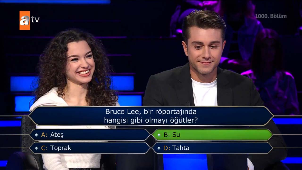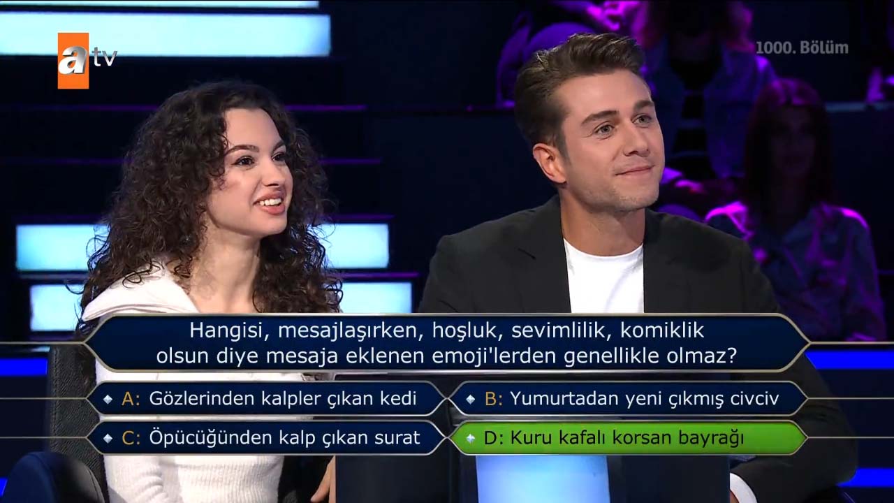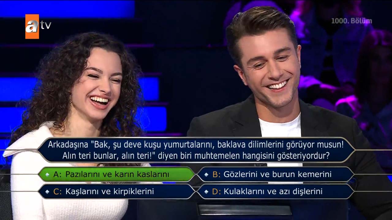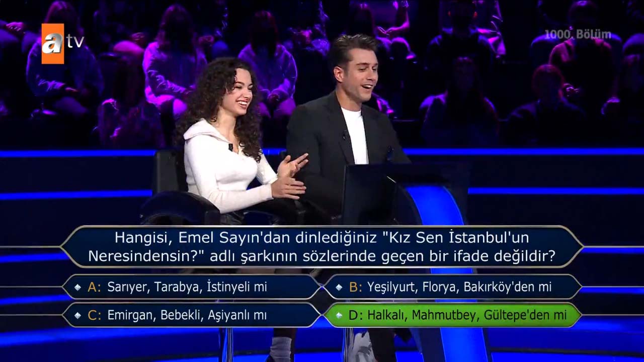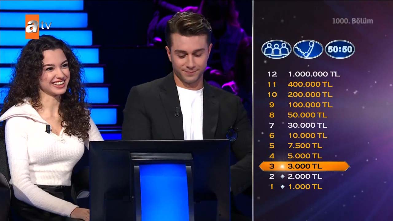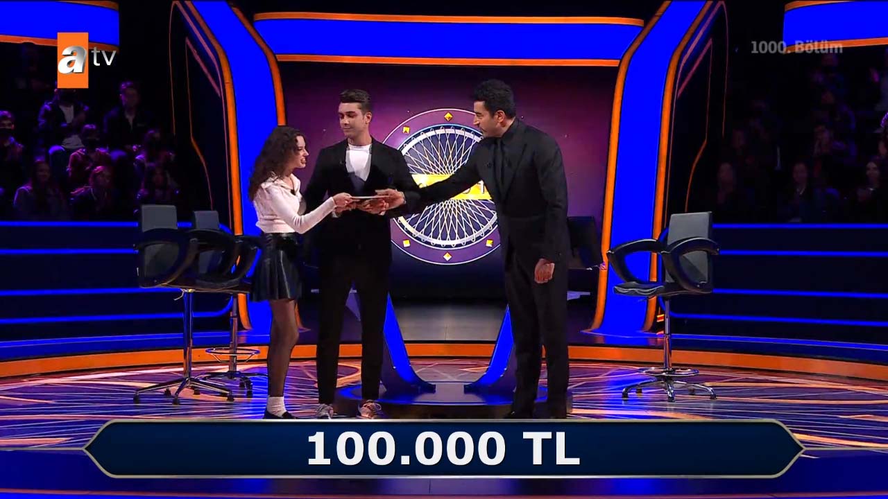 Ünlü ve yakışıklı oyuncu - sunucu Kenan İmirzalıoğlu'nun sunumuyla Atv'de fırtınalar gibi esen bilgi yarışması "Kim Milyoner Olmak İster?" 1000'inci programı ile ünlüleri ağırladı. Yalnız Kurt dizisinin 'MERYEM'i Brezilyalı oyuncu ve model Jessica May ile Yalnız Kurt dizisinin 'ALTAY'ı oyuncu Hasan Denizyaran, atv dizisi ALDATMAK'ın oyuncuları Feyza Sevil Güngör (Oylum Yenersoy ) ve Yusuf Çim (Ozan Yenersoy), diğer yandan yine Atv'de yayınlanan Kardeşlerim dizisinin genç ve başarılı oyuncuları "ASİYE" Su Burcu Yazgı Coşkun ve "DORUK" Onur Seyit Yaran "Kim Milyoner Olmak İster?" yarışmacısı oldu. Büyük heyecan yaratan Jessica May ve Hasan Denizyaran 400.000 TL'lik o soruda geri çekildi. Ayrıca iki oyuncu "Deli Yürek, Kurtlar Vadisi, Yalnız Kurt, Pars: Narkoterör" gibi birçok bomba yapıma imzasını atan usta yönetmen Osman Sınav'a kritik bir soru yönelttiler. İşte o sorular ve yanıtlar...