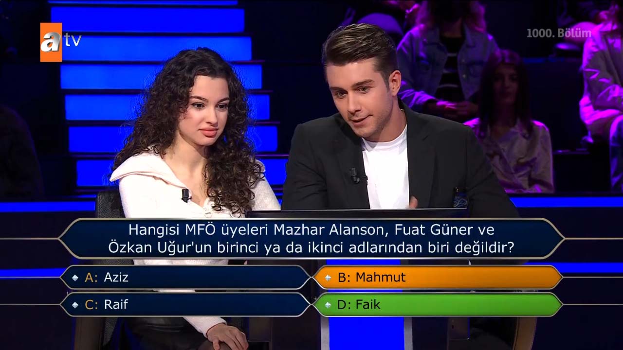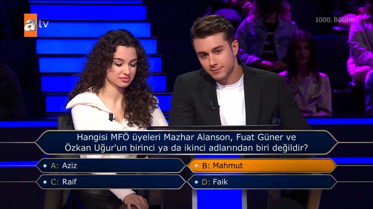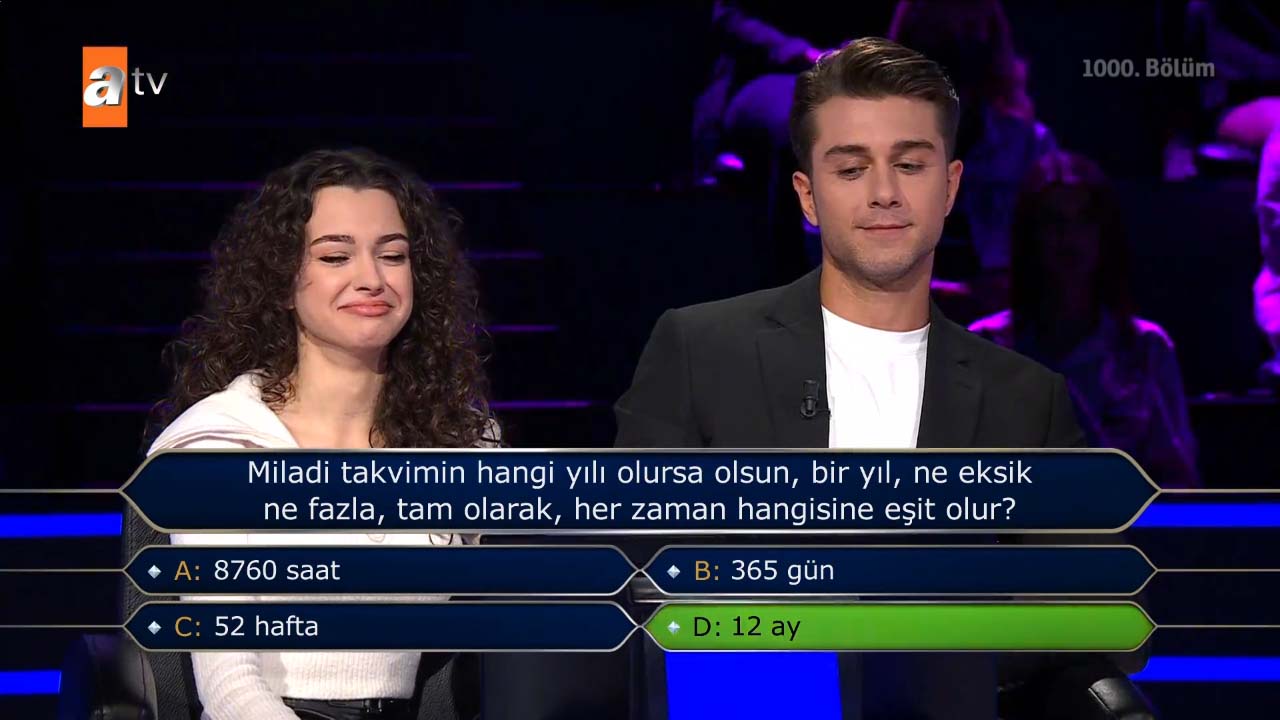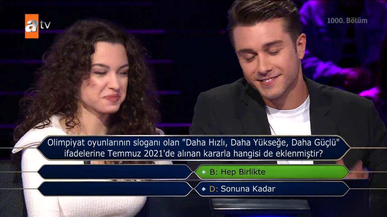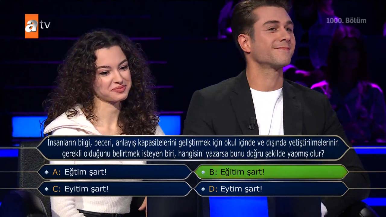 Ünlü ve yakışıklı oyuncu - sunucu Kenan İmirzalıoğlu'nun sunumuyla Atv'de fırtınalar gibi esen bilgi yarışması "Kim Milyoner Olmak İster?" 1000'inci programı ile ünlüleri ağırladı. Yalnız Kurt dizisinin 'MERYEM'i Brezilyalı oyuncu ve model Jessica May ile Yalnız Kurt dizisinin 'ALTAY'ı oyuncu Hasan Denizyaran, atv dizisi ALDATMAK'ın oyuncuları Feyza Sevil Güngör (Oylum Yenersoy ) ve Yusuf Çim (Ozan Yenersoy), diğer yandan yine Atv'de yayınlanan Kardeşlerim dizisinin genç ve başarılı oyuncuları "ASİYE" Su Burcu Yazgı Coşkun ve "DORUK" Onur Seyit Yaran "Kim Milyoner Olmak İster?" yarışmacısı oldu. Büyük heyecan yaratan Jessica May ve Hasan Denizyaran 400.000 TL'lik o soruda geri çekildi. Ayrıca iki oyuncu "Deli Yürek, Kurtlar Vadisi, Yalnız Kurt, Pars: Narkoterör" gibi birçok bomba yapıma imzasını atan usta yönetmen Osman Sınav'a kritik bir soru yönelttiler. İşte o sorular ve yanıtlar...