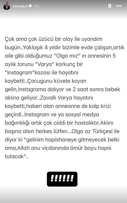 Akçıl, "Çok ama çok üzücü bir olay ile uyandım bugün. Yaklaşık 4 yıldır bizimle evde çalışan, artık aile gibi olduğumuz "Olga'mız" ın annesinin 5 aylık torunu "Varya" korkunç bir "Instagram" kazası ile hayatını kaybetti.