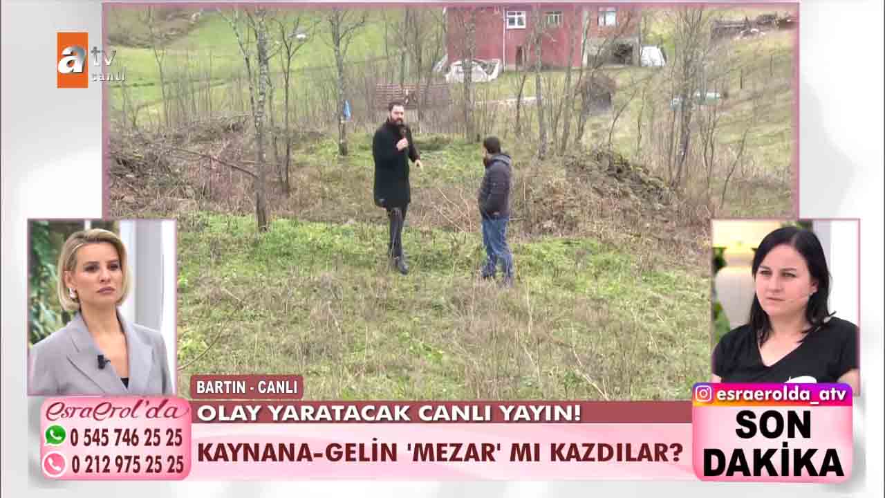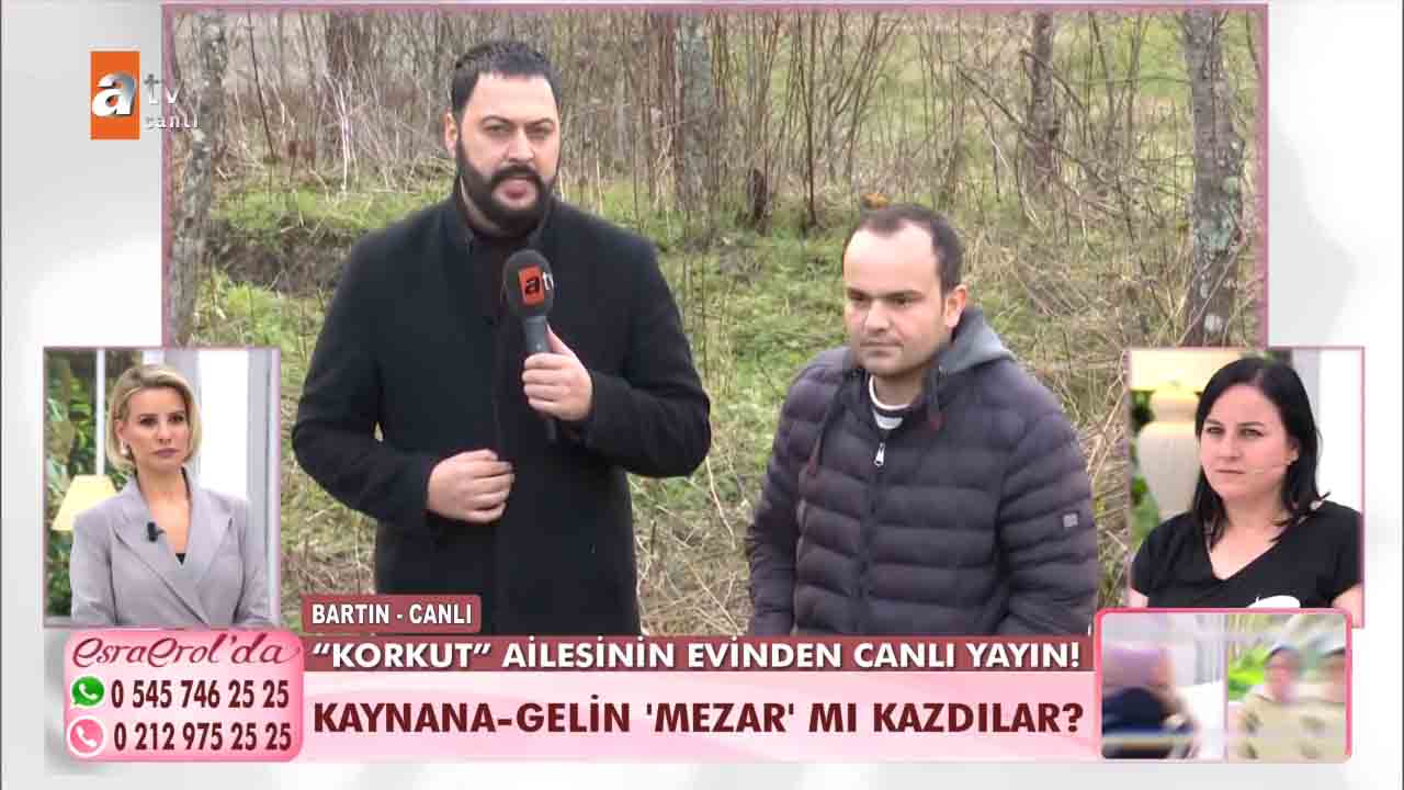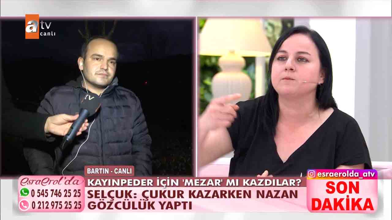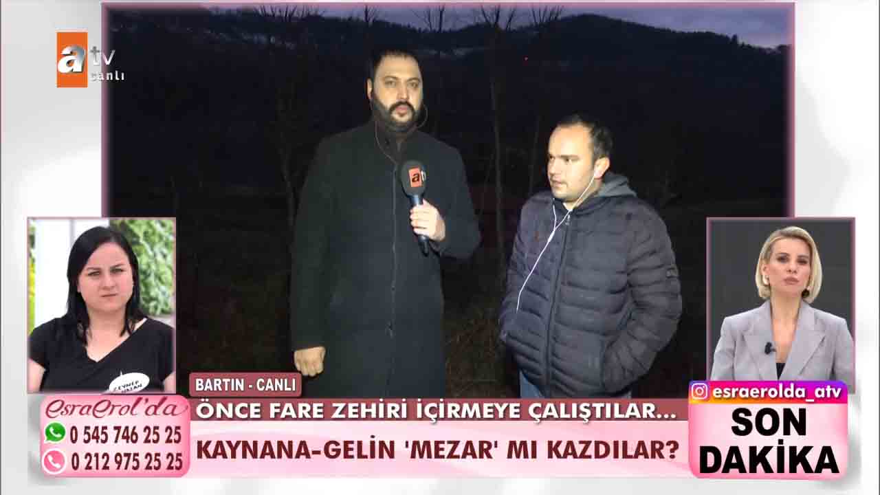 ATV'nin reyting rekortmeni programlarından biri olan Esra Erol'da bu hafta izleyicilerin büyük beğenisini kazandı. Geçtiğimiz günlerde eşinin bulunması için Esra Erol'a başvuran Selçuk Korkut'un eşi bulundu ve eşiyle yüzleşti. Zeynep Nazan Korkut'un anlattıkları ise Türkiye'nin gündemine oturdu. Korkut kayınvalidesiyle birlikte kayınpederini zehirlediğini itiraf etti. Bugün ise yeni bir gelişme yaşandı. Selçuk Korkut'un iddiası üzerine Esra Erol'un ekibi, Bartın'a gidilerek babası için kazılan mezar kontrol edildi. Selçuk Korkut, Eşi Zeynep Nazan'ın babasını öldürmek istediğini dile getirdi. Konuya ilişkin konuşan Selçuk Korkut, "Babamı zehirlemeye de çalıştı eşimin tutuklanmasını istiyorum. Karım seri katil olabilir" dedi. İşte yaşananlar...
