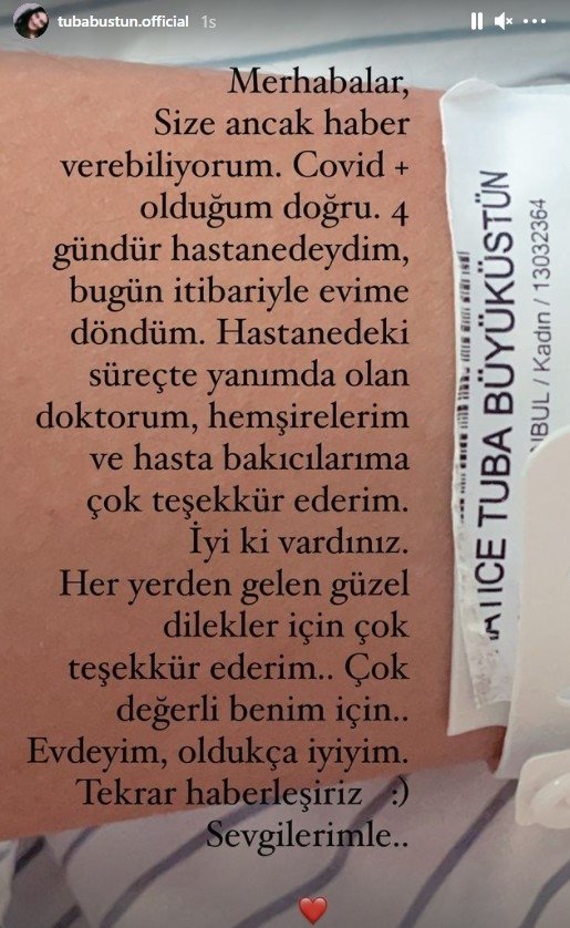 Hayranlarının yüreğine su serpen Büyüküstün, "Merhabalar, Size ancak haber verebiliyorum. Covid pozitif olduğum doğru. 4 gündür hastanedeydim, bugün itibariyle evime döndüm. Hastanedeki süreçte yanımda olan doktorum, hemşirelerim ve hasta bakıcılarıma çok teşekkür ederim. İyi ki vardınız. Her yerden gelen güzel dilekler için çok teşekkür ederim. Çok değerli benim için...Evdeyim, oldukça iyiyim. Tekrar haberleşiriz... Sevgilerimle..." ifadelerini kullandı.
