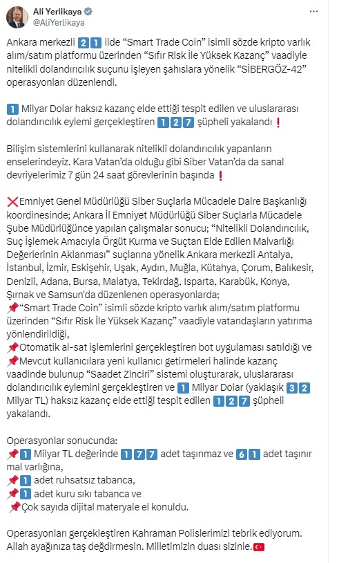 "Smart Trade Coin" isimli sözde kripto varlık alım satım platformu üzerinden 'Sıfır Risk İle Yüksek Kazanç' vaadiyle vatandaşları yatırıma yönlendirdiği, otomatik al-sat işlemlerini gerçekleştiren bot uygulaması satan ve mevcut kullanıcılara yeni kullanıcı getirmeleri halinde kazanç vaadinde bulunarak 'Saadet Zinciri' sistemi oluşturan, uluslararası dolandırıcılık eylemi gerçekleştiren ve 1 milyar dolar (yaklaşık 32 milyar lira) haksız kazanç elde ettiği tespit edilen 127 şüpheli yakalandı."