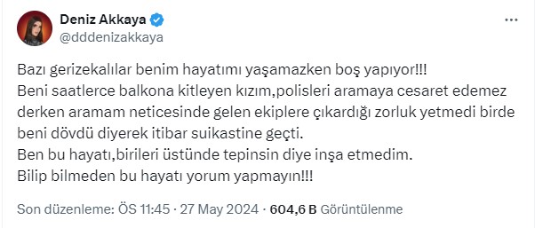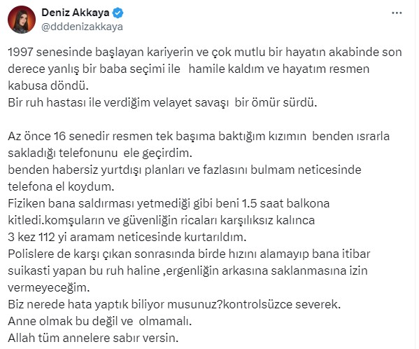 "Deniz Akkaya sosyal medyasından acayip bir paylaşım yaptı. Dedi ki: "1997 senesinde başlayan kariyerin ve çok mutlu bir hayatın akabinde son derece yanlış bir baba seçimi ile hamile kaldım ve hayatım resmen kabusa döndü. Bir ruh hastası ile verdiğim velayet savaşı bir ömür sürdü. Az önce 16 senedir resmen tek başıma baktığım kızımın benden ısrarla sakladığı telefonunu ele geçirdim. Benden habersiz yurtdışı planları ve fazlasını bulmam neticesinde telefona el koydum. Fiziken bana saldırması yetmediği gibi beni 1.5 saat balkona kilitledi. Komşuların ve güvenliğin ricaları karşılıksız kalınca 3 kez 112'yi aramam neticesinde kurtarıldım.
