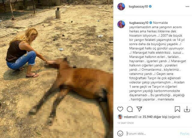 Instagram hesabından çiftliğin çevresine kadar gelen yangınlarda dumandan zehirlenerek hayatını kaybeden atıyla bir fotoğrafını paylaşan Tuğba Özay, şu ifadeleri kullandı: