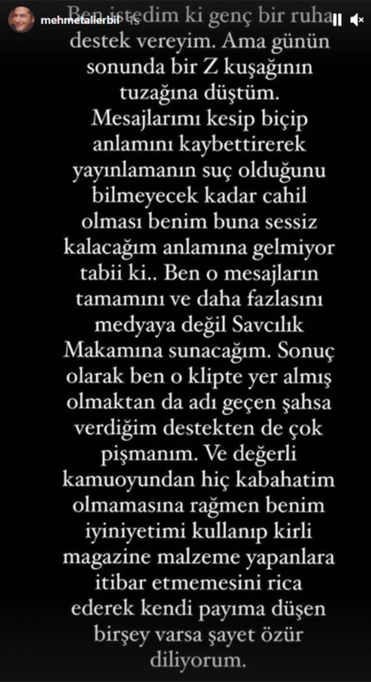"Şiddet diyorum çünkü psikolojik şiddet de şiddetin bir türevidir. Mehmet Ali Bey'i linçlemiştim, sonra bana mesaj atıp ağlayarak hastayım dediği için konuyu kapatıp özür dilemiştim. Klibimde oynamasını teklif ettim, kabul etti. Zaten çok değil, 5 saniye falan görünüyor klipte. Klip sonrası ahlaksızlıklar her geçen gün level atlayarak büyüdü. Görmezden gelmeye çalıştım, yaşına ve bulunduğu konuma saygımdan sessiz kalmaya çalıştım"