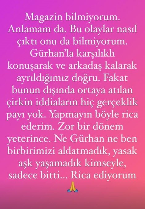 "Gürhan'la karşılıklı konuşarak ve arkadaş kalarak ayrıldık. Fakat bunu dışında ortaya atılan çirkin iddiaların hiç gerçeklik payı yok. Yapmayın böyle şeyler... Zor bir dönem yeterince. Ne Gürhan ne de ben birbirimizi aldatmadık. Kimseyle yasak aşk yaşamadık. Sadece bitti! Rica ediyorum."